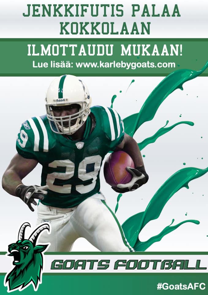 Monilajiseura Karleby Goats aloittaa amerikkalaisen jalkapallon toiminnan. Ensimmäinen avoin treeni on la 5.10.2019 Kokkolan Kipparihallissa. ILMOITTAUDU MUKAAN NYT! TULE KOKEILEMAAN AMERIKKALAISTA JALKAPALLOA! Ei ole väliä oletko pitkä tai lyhyt, iso tai pieni, voimakas tai nopea. Kaikkia tarvitaan, sillä pelipaikkoja on monia. Karleby Goats järjestää maksuttoman avoimen kokeilukerran kaikille yli 16-vuotiaille Kokkolan Kipparihallissa 5.10 klo:16-18. Mukaan tarvitset vain urheiluvaatteet! Tervetuloa rohkeasti kokeilemaan ja tutustumaan lajiin. Ilmoittaudu lomakkeella