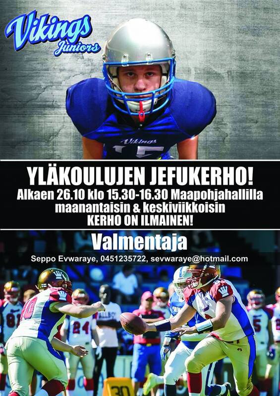 Yläkoulujen jenkkifutiskerho käynnistyi Vaasassa. Vaasa Vikingin jenkkifutiskerho on käynnistynyt Maapohjahallilla (Sepänkyläntie 14-16, 65100 Vaasa). Harjoituksia on kahdesti maanantaisin ja keskiviikkoisin klo 15.30-16.30. Aiempaa kokemusta lajista ei tarvita ja kerho on ilmainen. Valmentajana toimii Seppo Evwaraye |