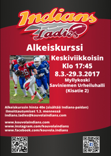 Kurssilla opitaan perustekniikoita sekä sääntöjä ja hankitaan valmiudet liittyä Indiansin naisten edustusjoukkueeseen kaudelle 2017 Kouvola Indiansin naisten joukkue järjestää uusille harrastajille alkeiskurssin maaliskuussa. Kurssi alkaa keskiviikkona 8.3. Saviniemen urheiluhallissa (Kisatie 2) 17.45–19:15 ja jatkuu siitä alkaen samaan aikaan keskiviikkoisin. Kurssi pitää sisällään lajin perustekniikoita ja sääntöjä sekä antaa valmiudet liittyä mukaan naisten edustusjoukkueeseen kaudelle 2017. Aikaisempaa lajikokemusta ei tarvitse. Alkeiskurssin hinta on 40e (sisältää kurssin ajan valmennuksen/ohjauksen, varusteet sekä Indians T-paidan) ja se maksetaan ensimmäisissä harjoituksissa (käteinen, kortti tai liikunta-/kulttuurisetelit). Harjoituksiin kannattaa ottaa mukaan: liikuntavarusteet (hallissa keinonurmi, lämpötila noin 13°C), juomapullon sekä reipasta mieltä.