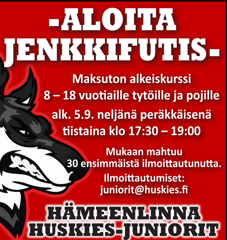 Hämeenlinna Huskies järjestää ti 5.9. alkaen maksuttoman alkeiskurssin 8-18 v tytöille ja pojille. Kohderyhmä: 8-18-vuotiaille tytöille ja pojille Neljä harjoituskertaa järjestetään klo 17.30-19.00 Ilmoittautumiset: [email protected] |