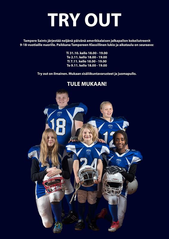 Ilmainen try out käynnistyy torstaina 31.10. "Hei sinä Tampereella tai sen lähikunnissa asuva 9-18-vuotias! Tampere Saints järjestää kuun vaihteessa nelipäiväiset amerikkalaisen jalkapallon kokeilupäivät Tampereen klassillisen lukion tiloissa.