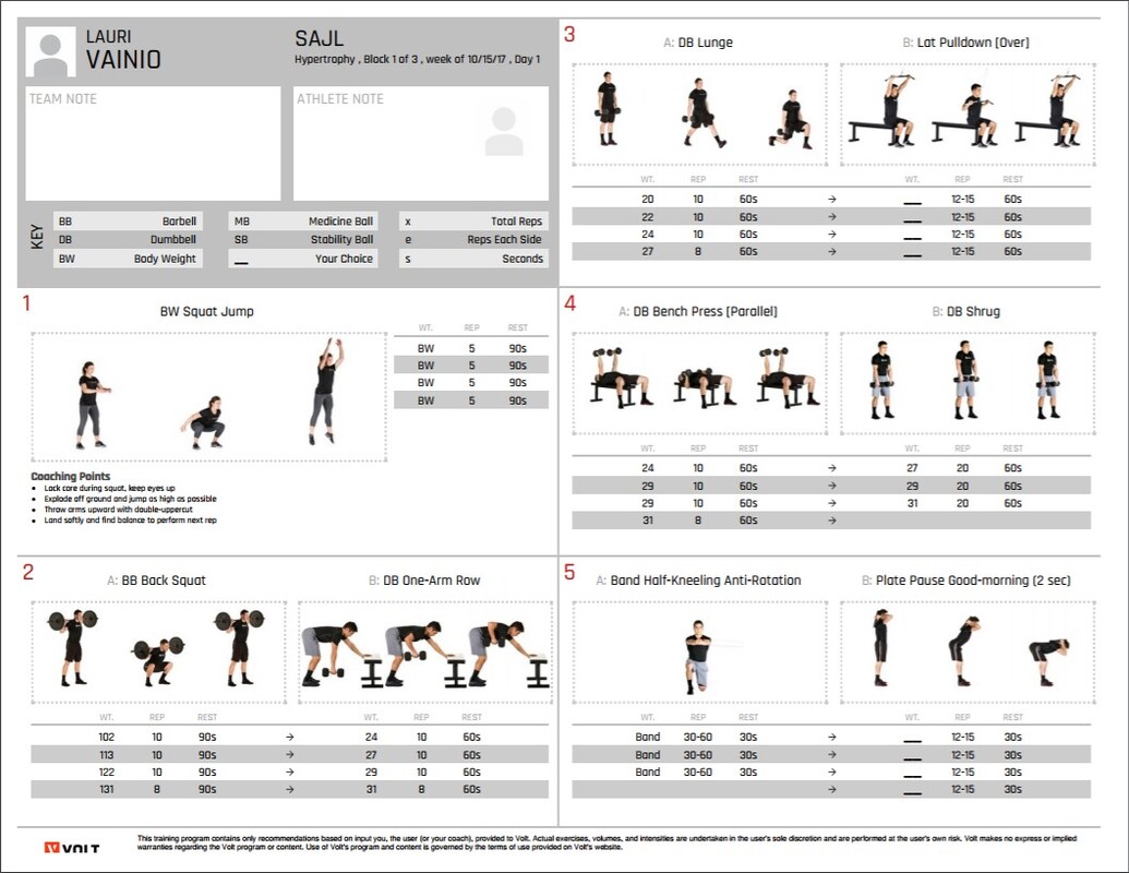 Male All-Around Athlete Level Two (4-Day) This program features balanced movement patterns and 4 days per week of training in the off-season. The training is designed to build all-around athleticism and is appropriate for male athletes with 2+ years' experience in a serious training program. Tiedustelut: Heikki Halttunen koulutuspäällikkö sähköposti:heikki.halttunen(at)sajl.fi gsm: +358(0)40-569 6644 Lauri Vainio (miesten maajoukkueen linjapuolustaja, Roosters, Berlin Rebels) on käyttänyt kolme vuotta Volt Athleticsia.Volt Athletics oli minulle urheilijana "game-changer". Aikaisempina kausina olin perustanut voimaharjoitteluni klassisempiin voimanostoihin perustuviin ohjelmiin. Halusin kuitenkin muutosta ja parannusta fysiikkaani kaudelle seuraavalle kaudelle, minkä takia päädyin harjoittelemaan off- ja in-seasonin Volt Athleticsillä. Muutos kannatti, sillä kausi toi minulle mm. Vaahteraliiga All-stars Team ja Vuoden Aalto-urheilija -palkinnot. Parasta Voltissa ovat ohjelman järjestelmällisyys, suunnitelmallisuus ja jaksotus. Urheilijan ei tarvitse miettiä yhtään mitään treenin aikana: ei liikkeitä, ei toistomääriä, ei painoja, ei palautumisaikoja; ei siis yhtään mitään! Kaikki säätäminen ja miettiminen on poistettu ohjelmasta, ja urheilija voi keskittyä vain olennaiseen eli treenaamiseen. Yksittäisten treenien sisältö on myös jaksotettu fiksusti. Yhdessä treenissä on yksi kova pääliike ja muutamia apuliikkeitä. Tästä syystä kroppa pysyy tuoreena muita viikon treenejä varten. Ohjelmassa on myös huomioitu eri pelipaikolla tarvittavat fyysiset ominaisuudet. En voisi kuvitella harjoittelevani tulevaisuudessa enää millään muulla kuin Volt Athleticsin ohjelmalla!"