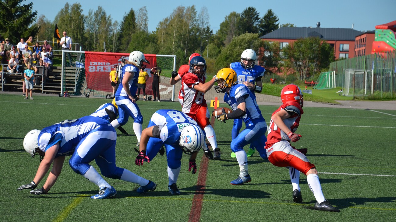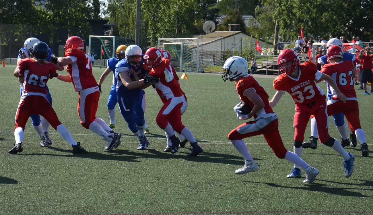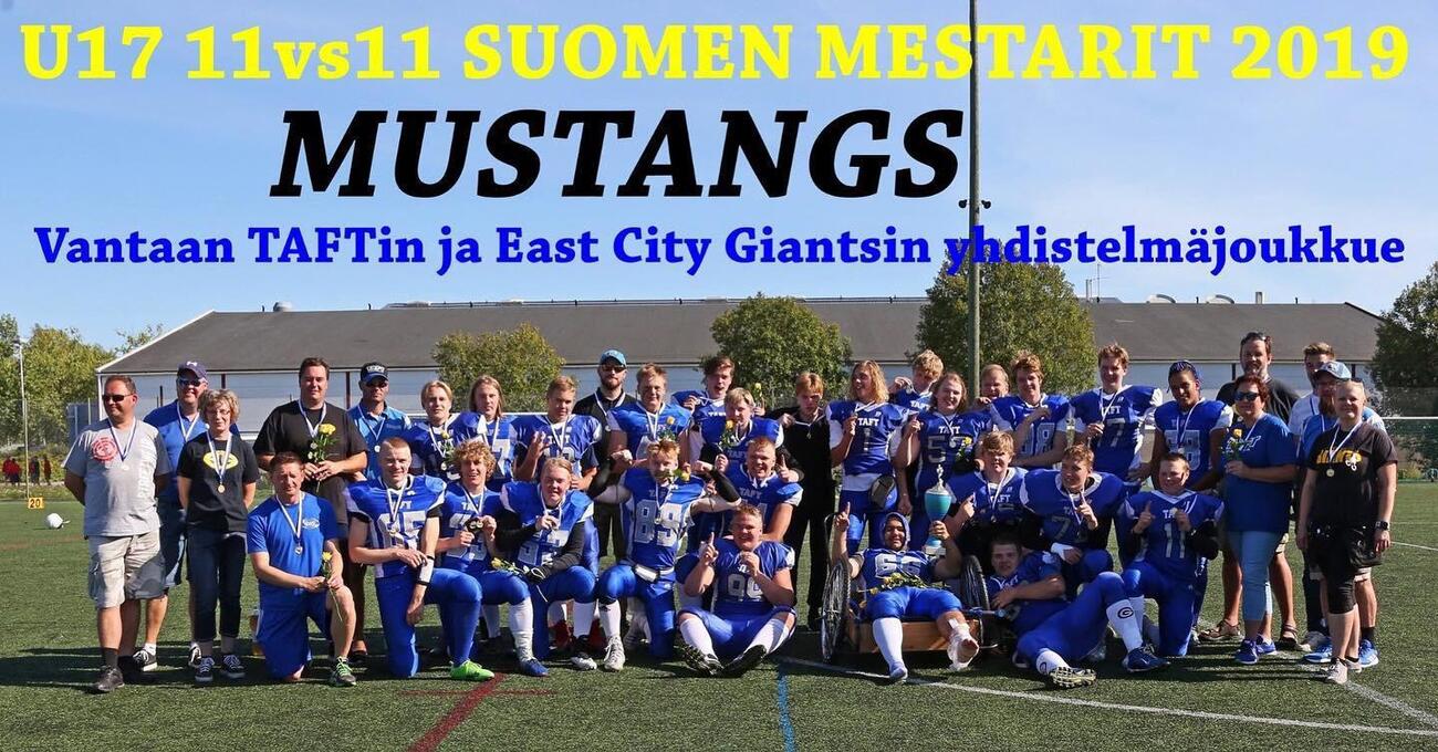 Vantaa TAFT:in ja East City Giantsin yhdistelmä joukkue kukisti Roostersin 52-0 1-divisioonan voittaja oli Tampere Saints ja 2-divisioonan Hämeenlinna Tigers. Aurinkoinen Tikkurilan keinonurmikenttä oli U17 SM-sarjan finaalin näyttämönä. Ottelun Ottelun oli seuraamassa noin 250 katsojaa. Alku oli tasainen kuten yleensä finaaleissa. Mustangsin päävalmentaja Teppo Viljasta paikannut Henri Kurki luotti ottelun alussa juoksupeleihin. Ron Efrati hoiti kiertopelit ja 110kg muskeliback Bergan Dugan juoksi linjanläpipelit. Parivaljakko kuljetti 95 jaardia pelivälinettä eteenpäin ja Dugan junttasi avausosuman 6-0 ensimmäisen neljänneksen puolessa välissä. 2. qtr aluksi Roosters pääsi 11 jaardin päähän maalista. Markus Asplund otti pelinrakentaja Jerry Silomaan heiton kiinni maalialueella, mutta joukkue oli syyllistynyt virheeseen. Tämän jälkeen Mustangsin puolustus oli tiukkana ja pakotti helsinkiläiset taaksepäin 4./30 tilanteeseen. Tasoitusmaalia ei lopulta tullut. Roostersin juoksuhyökkäys ei edennyt ja kun peliaikaa oli jäljellä 4:18 Tommy Nylund juoksi 18-0 numerot Tikkurilan Urheilupuiston tulostaululle. Nooa Kurki otti 2 pisteen arvoisen heiton ja lisäsi johtoa 20-0 tilanteeksi. # 33 Ron Efrati oli kovassa kunnossa ja hän liikkui liukkaasti sivusuunnassa ja porhalsi ottelussa toisen maalinsa ja joukkueensa 26-0 johtoon. Nooa Kurki lisäsi 2 lisäpistettä. Mustangsin taukojohto oli selvä 28-0. Kolmannella neljänneksellä Jerry Silomaa heitti aktiivisemmin. Ebbe Westerberg ja Alvar Fageroos ottivat koppeja, mutta Roosters ei päässyt enää ottelussa maalintekoalueelle. Mercy rule eli suora ajanotto tuli käyttöön 36-0 tilanteessa. Varmasti pelannut tukimies 190cm 95 kiloinen Felix Salonen otti ottelun ainoan syötönkatkon. Tämän jälkeen Tommy Nylund pohjusti ottelun seuraavan maalin pitkällä kiinniotollaan. Ron Efrati jatkoi maalitehtailuaan ja teki Kalliokosken heitosta 14 jaardin maalin. Efrati viimeisteli myös lisäpisteet ja tilanteeksi saatiin 44-0. Mustangsin Valtteri Rajala teki ottelun viimeisen maalin. Santeri Kotavalko teki 2 lisäpistettä ja loppunumeroiksi 52-0. Roostersin hieman kevyempi kalusto ei rittänyt tässä finaalissa tasaiseen yhteenottoon. Mustangsin hyökkäyslinja ot Samuel Leppänen, og Sampo Leppänen, c Niko Timoskainen, og Niko Pitkänen, ot Veeti Stenman.Taisteluhalua joukkueella kuitenkin riitti, mutta Mustangsin yhdistelmä oli tällä kertaa mestariainesta. U17 SM-sarjan ottelun MVP rb Ron Efrati, Mustangs