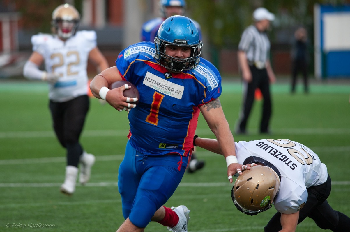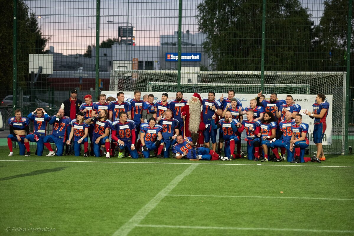 II-divisioonan mestaruus tuli Rovaniemi Nordmenille jo toisen tappiottoman kauden päätteeksi. Nordmen kukisti Rautamaljassa Porvoon Teurastajat 26-6 (21-6). Rovaniemen keskuskentällä 7.9. pelatussa ottelussa Neljän Tuulen Soturit saivat vastaansa myös tappiottoman kauden pelanneen porvoolaismiehistön. I neljänneksen ensimmäisellä hyökkäysvuorolla Teurastajat tekivät maalin heti ensimmäisellä yrityksellä. Pelinrakentaja Mikael Järvinen pitchasi pallon tuulennopealle Uche Nwosulle, joka kiitti kunniasta ja purjehti oikeaa laitaa pitkin maaliin. Lisäpistepeli epäonnistui. 0-6 johto Teurastajille. Nordmen ei kuitenkaan tästä häkeltynyt vaan eteni seuraavalla hyökkäysvuoroalla pallon kanssa varmasti kohti keskikenttää. Rafael Pineda heitti 37 jaardin maalin keskushyökkääjä Hannes Harjulle. Tomi Väänänen potkaisi lisäpisteellä Normenin johtoon 7-6. Lyhyeksi jääneen porvoolaisten lentopotkun jälkeen Nordmen pääsi hyökkäämään hyvästä kenttäasemasta 44 jaardin päästä. Rafael Pineda teki 13-6 numerot omalla kahden jaardin juoksullaan. Väänänen lisäsi pisteen potkaisemalla. Nordmen johti 14-6. Kahteen suuntaan pelannut pelaajavalmentaja Pineda on saanut rovaniemeläisen jenkkifutiksen kukoistuksen tilaan. Ahnaasti pelannut puolustus oli tehdä safetyn ensimmäisellä neljänneksellä, kun Juhana Pelkonen säkitti Mikael Järvisen aivan maalialueen tuntumassa. Toisella neljänneksellä Nordmen jatkoi tasaista tahtia. Kapellimestari Pineda teki toisen maalinsa jaardin päästä ja Väänänen potkaisi lisäpisteen. Puoliaikatilanne 21-6. Kolmannella neljänneksellä Nordmenin laitahyökkäjä Alfonso Ikäheimo teki komean heittopelin päätteeksi maalin. Väänäsen potku onnistui ja Rovaniemi johti turvallisesti 28-6. Teurastajille puolen kentän ylittäminen oli vaikeaa kurinalaisesti pelanneen Nordmen puolustuksen johdosta. Nuorista vaahteraliigapelaajista koottu Butchersin kasvattajajoukkue pelasi sisukkaasti, mutta tiukassa ottelussa se ei saanut hyökkäysrytmiä päälle. Teurastajat kokeili kikkapeliä kolmannella jaksolla flea flickerin muodossa, mutta Nordmenin Roni Laine katkaisi heiton tyylikkäästi ja lisäpisteitä ei enää tehty. Kolmenkymmenenyhden pelaajan rosterilla esiintynyt Nordmen pelasi kovaa pohjoisen futista. Kokemus ja muskelit olivat liikaa alle 20 pelaajan ryhmällä esiintyneelle porvoolaisyksikölle. Rovaniemi Nordmenin kahdeksastoista peräkkäinen voitto oli tosiasia. Finaali päättyi numeroihin 28-6. Nordmenin valmentaja Mikko Vähätalo: - Joukkue pelasi scouttitiedon mukaisesti ja olemme päässeet harjoittelemaan Rautamaljan luovutii 2-divisioonan mestarijoukkueelle itse joulupukki. Ensimmäisenä kiertopalkinnon kohotti viimeisen jenkkifutisottelunsa pelannut konkarilinjapelaaja Jari Haste, joka lopetta tähän kauteen uransa 57-vuotiaana. Team MVP rb/de Uche Nwosu, Porvoon Teurastajat