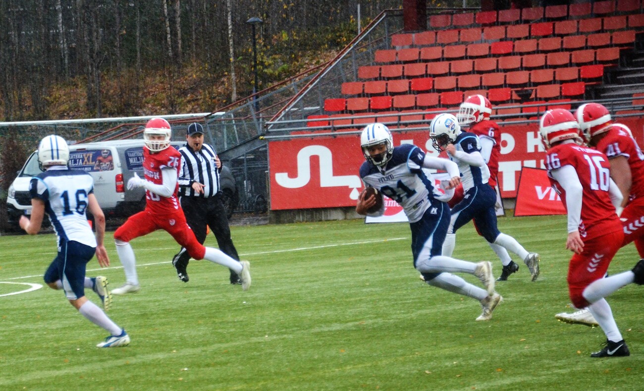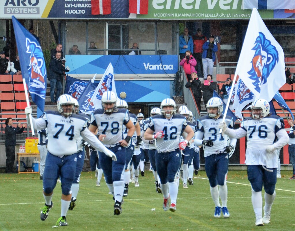 Vantaalla pelatussa Tanska-ottelussa Suomi oli hallitsevassa roolissa. Maiden ensimmäinen miesten tasolla käyty kamppailu päättyi Suomen voittoon 44-3 (20-3). Ensimmäisellä neljänneksellä Tanska kulutti aikaa ja piti palloa. Pelinrakentaja Thomas Zinck Thellufsen oli pirteällä pelipäällä ja toi joukkueelleen omilla juoksuillaan tärkeitä ensimmäisiä yrityksiä. Ville-Valtteri Suojanen ja Janne Kreuss pelasivat tarkasti kolmannet yritykset. Tanskan linjapuolustaja Mads Nielsen onnistui säkittämään pelinrakentaja Kadmiryn. Suomen lentopotku jäi lyhyeksi ja jälkitilanteessa Tanskan Lasse Lykke eteni pallon kanssa jo 5 jaardin päähän Suomen maalista. Suomen puolustus pysäytti kolme yritystä ja 4. yrityksenä Tanska potkaisi ottelun ainoat pisteet 0-3 Aske Klixbülin kenttäpotkumaalilla. Mickey Kyei palautti aloituspotkun yli puolen kentän. Sitten alkoi Suomen palloralli, jossa Veikka Lehtonen ja Miro Kadmiry vuorottelivat pallonkantovuoroissa. Tukimies Jimi Laursen taklasi screen-pelin miinuksille. Mutta Suomi jäi neljänneksen lopussa hyviin asemiin. Tanska hallitsi hienoisesti ensimmäistä neljännestä ja johti ottelua 0-3. Suomi nousi valta-asemaan toisella neljänneksellä. Karri Pajarinen kiitti linjan blokkityöskentelystä ja teki Suomen avausmaalin heti 2. neljänneksen alkajaisiksi. Roope Niskanen potkaisi lisäpisteen. Suomi johtoon 7-3. Puolustuskoordinaattori Karppisen joukot olivat valppaana seuraavan yritysvuoron ja pakottivat tanskalaiset lentopotkuun. Upea pitkä heittopeli Sebastian Sagnelle toi Suomen red zonelle. Tom Suoste jatkoi siitä mihin Pajarinen jäi ja toi Suomea lähemmäksi maalilinjaa. Hyökkäysvuoron päätti Mikko Seppänen, joka juoksi itsensä vapaaksi ja teki heittomaalin maalialueen kulmassa. Suomi johtoon 14-3. Suomi otti kenttäasemataistelun haltuun. Tuukka Lehtoselle avautui valtava latu ja hän suihki itsensä lähelle Tanskan maalia. Mickey Kyei otti kaksi heittoa kiinni ja lisäsi johtoa 20-3. Niskanen potkaisi tolppaan kolmannen lisäpistepotkunsa. Janne Kreussin syliväli oli käytössä koko mitassaan ja hän teki jälleen ratkaisevan taklauksen Suomen pysäyttäessä Tanskan hyökkäyksen kolmen yrityksen jälkeen. Tämän jälkeen Suomi alkoi hieman ahnehtia hyökkäyspuolella ja märät pallot aiheuttivat harmaita hiuksia pelinrakentajille. Tanska sai syötönkatkoja ja mahdollisuuden tasoittaa ottelua. Suomi sai ensimmäisen neljänneksen viimeisellä minuutilla pallon haltuun. Tanskalaistukimies rikkoi Ville Karhista roikkumalla hänen selässään heiton aikana. Jatkotilanteessa Tanska sai kolmannen syötönkatkon Lau Hartoftin toimesta. Keskushyökkääjä Veikka Lehtonen pelasti lähes varman maalin ja Tanska pääsi vielä kerran yrittämään pisteiden tekoa. Ville-Valtteri Suojanen puolusti varmasti pelipuoliskon viimeisen heiton. Kolmas neljännes aloitettiin Suomen pirteällä hyökkäyspelillä. Karri Pajarisen pomppukoppi vei Suomen hyviin asemiin. Leijonat pääsivät kahden tanskalaisrangaistusten johdosta muutaman jaardin päähän maalista. Veikka Lehtonen ponnisti maaliin Seppo Evwarayen ja Martin Veinbergin muodostaman seinän takaa. Roope Niskanen potkaisi tilanteeksi 27-3. Tanska jatkoi taistelua, mutta menetti otteen pallosta ja ensimmäistä maaotteluaan pelannut linjapuolustaja Toni Lindholm peitti pelivälineen. Seuraava vuoro käytettiin tarkasti juosten.Tom Suosteen ja Tuukka Lehtosen jakaessa vastuuta. Suomi eteni vääjäämättömästi kohti Tanskan maalia. Suomen hyökkäyslinja toimi kuin palomuuri ja ei päästänyt tanskalaisviruksia pallonkantajien kimppuun. Tuukka Lehtonen jatkoi paukutusta ja johto kasvoi 34-3 numeroihin. Seuraavakin mahdollisuus käytettiin hyväksi. Kahden juoksupelin jälkeen Veikka Lehtonen teki toisen maalinsa pelipuoliskolla. Myyrmäen jalkapallostadionin sähköinen tulostaulu näytti numeroita 41-3. Kun pelikellossa oli jäljellä seitsemän minuuttia viimeisteli Roope Niskanen kenttäpotkumaalin ja kasvatti Suomen voittonumeroiksi 44-3. Maiden ensimmäinen maaottelu miesten tasolla päättyi Suomen ylivoimaiseen voittoon. Game MVP Finland de Edward Vesterinen