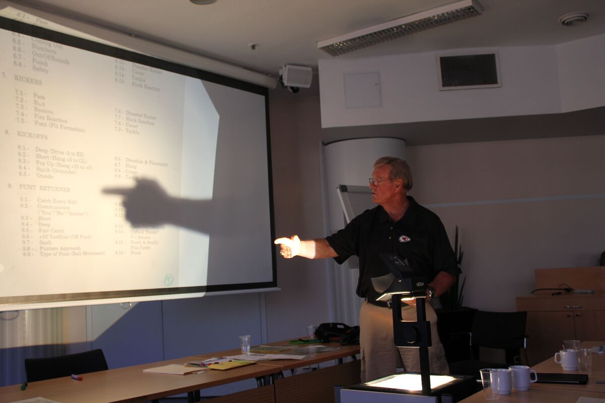 Nelikymmenpäinen valmentajayleisö sai kahden päivän aikana melkoisen määrän oppia jenkkifutiksen eri osa-alueista. Valmentajat Jim Criner, Lynn Stiles ja Philip Gardent luennoivat vuorotellen useasta pelaamisen ja harjoittelun osa-alueesta. Yhdistävänä tekijänä kaikki korostivat säännöllistä kovaa työntekoa ja perusasioiden tinkimätöntä valmennusta.
