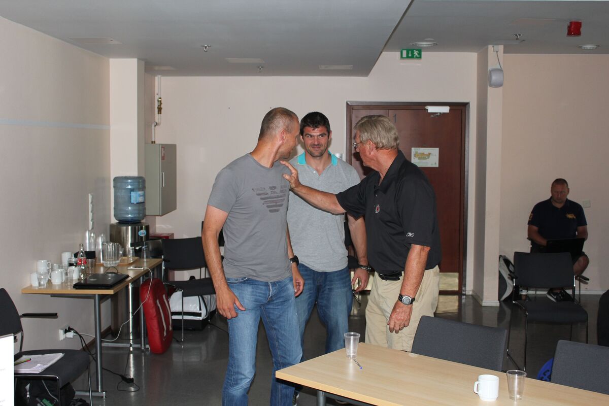 Jim Crinerin luentojen pääaiheena oli moderni spread option-hyökkäys ja sellaista vastaan puolustaminen. Criner näkee pistol/shotgun-option hyökkäyksen sopivana eurooppalaiseenkin peliin mm. seuraavista syistä: - QB:n asema kauempana linjasta kuin perinteisessä optionissa helpottaa lukuja, ’exchange point’ on helpompi. - OL perusblokit ovat yksinkertaisia oppia ja opettaa (down/combo, 2 vs 1) - read-konsepti antaa ’yhden blokkaajan lisää’ - hyökkäystapa pakottaa puolustuksen takakentän juoksuun, avaa playaction-heittoja - vähentää syötönkatkoja, pääosin helppoa lyhyttä heittoa levitettyyn puolustukseen - pakottaa muodostelmien määrällä, shifteillä ja motioneilla puolustuksen mukautumaan Nimestään huolimatta Crinerin esittelemä hyökkäystapa ei ollut ’pelkkä’ option, pakettiin kuului perusjuoksua, screenejä, playaction-heittoa jne. Pääajatus taustalla oli hyökkäystavan tehokkuus ja sen opettamisen ja oppimisen helppous. Criner nimenomaan korosti hyökkäyksen monipuolisuuden tärkeyttä tarkkaan rajatuilla ja rakennetuilla elementeillä. Criner esitteli myös spread optionin puolustamista 34-, 43- ja 46-esimerkein. Hyökkäyksen rytmin ja ajoitusten ollessa hiukan perinteisestä poikkeavaa, pitää puolustuksen pelaamisenkin hiukan muuttua. Esim. linebackereiden etäisyyttä aloituslinjasta voi ja kannattaakin hiukan pidentää sivuttaisen liikkumisen mahdollisuuden varmistamiseksi ja siksi että pistol- ja shotgun-pelit eivät käytännössä voi iskeä linjaan yhtä nopeasti kuin esimerkiksi perinteisen option-hyökkäyksen dive. Philippe Gardent luennoi LB-pelaamisen perusteista stancesta alkaen. LB:n lperusiikkuminen, blokin voittaminen ja taklaaminen käytiin huolella läpi, samalla hyviä drillejä esitellen. Gardent suositteli valitsemaan drillit joita tehdään joka päivä sekä pysymään niissä ja käyttämään lämmittelyjä lisäaikana niiden teettämiseen. Coaching pointeja max 2-3 per harjoite, ja yleisesti koko joukkueen valmentajistolle ohje opettaa samoja tekniikoita. Gardentin toinen pääaihe oli fysiikan kehittäminen. Hän esitteli pelipaikkajakoisen listauksen lajin fyysisistä vaatimuksista ja keskittyi luennossaan nopeuden, suunnanmuutosnopeuden ja räjähtävän voiman kehittämiseen. Kattavassa luennossaan Gardent ehti käymään läpi herkkyyskausia, fysiikka- ja lajiharjoitteiden yhdistämistä sekä voiman eri osa-alueita ja niiden vahvuuksien ja heikkouksien tunnistamista ja merkitystä. Lynn Stilesin osuudet klinikalla olivat hiukan toisenlaisia luonteeltaan kuin muiden. Stilesilla on takanaan 30:n vuoden valmennusura NFL:ssä ja jo sitä ennen menestyksekäs Div1A-ura. Miehellä on neljä Super Bowl-sormusta, joista yhtä sai Suomessakin mukana ihailla. Stilesin luennot eivät seuranneet aiheiltaan tarkasti etukäteen saatua listausta, ja hän aloitti jokaisen osuuden kuvailemalla arvoja, ihmisyyttä, johtajuutta, asioita ja ilmiöitä jotka saavat joukkueen menestymään. Huikeaa kuunneltavaa mieheltä joka on toiminut valmentajana joukkueissa joissa ovat pelanneet mm. Joe Montana, Steve Young, Jerry Rice, Ronnie Lott jne jne. Stilesin esityksistä varmasti moni sai itselleen mukaan sanoissa lyhyitä lauseita joiden takana on isoja valmennuksellisia ajatuksia. Klinikka oli menestys, valmentajien teettämässä palautekyselyssä 90% vastaajista ilmoitti tulevansa samanlaiselle uudestaan kun sellainen järjestetään. |