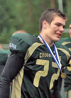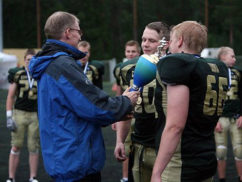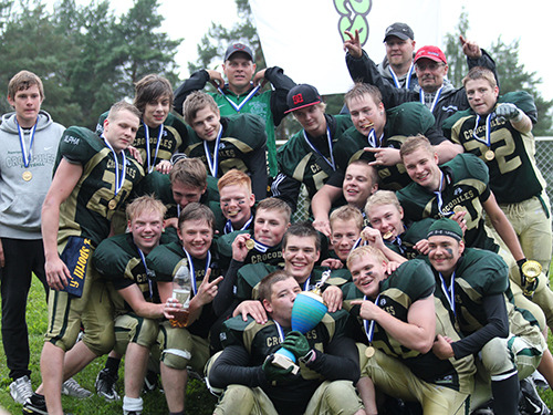 Crocodiles mestariksi finaalissa Trojansia vastaan. Pronssia Roostersille. La 17.8 Nordic Nutrients Areenalla pelattiin U17 ikäluokan mestaruudesta Seinäjoki Crocodilesin ja Turku Trojansin välillä. Sateisessa säässä parin sadan katsojan edessä edessä Crocodiles käänsi ottelun itselleen tasaisen ensimmäisen puoliskon jälkeen 34–3 (6–0). Maajoukkueen cornerback Tuomas Leinonen avasi ottelun laulamalla Maammelaulun. Ensimmäisellä hyökkäysvuorollaan Crocodiles käytti kelloa tehokkaasti ja pelasi peräti 8,5 minuuttia ensimmäistä maaliin johtanutta yrityssarjaansa. Keskushyökkääjä Kalle Laitila juoksi ottelun ensimmäisen puoliskon ainoat pisteet lisäpisteen epäonnistuessa. 6–0 Crocodilesille. Turun hyökkäyssuunnitelma meni uusiksi, kun pelinrakentaja Mika Riihimäki loukkasi polvensa jakson lopussa ja joutui jättämään pelikentän. Myös turkulaisten Thach Mai pelasi kipukynnyksen äärirajoilla loukkaantuneen ranteen johdosta. Kolmannella neljänneksellä Crocodilesin vahva linjapelaaminen pääsi oikeuksiinsa ja seinäjokiset tekivät kaksi maalia. Hyvin pelannut Kalle Laitila juoksi 60 jaardisen maalin ja tilanteeksi 12-0. Jukka Ristolainen lisäsi lisäpistepotkulla johdon 14-0. Crocodiles sai hyvän pelivireen ja onnistui seuraavalla drivellaan pelinrakentaja Juha Luurin pitkällä heitolla Antero Erkinheimolle etenemään aimo siivun kenttää eteenpäin. Kalle Laitila teki pelijaksolla vielä kolmannen maalinsa. Trojansin 14-vuotias varapelinrakentaja Heikki Toivola pelasi ennakkoluulottomasti ja väläytteli juoksutaitoaan muutaman kerran. Viimeisellä neljänneksellä Trojans teki avauspisteensä, kun Jussi Veijula teki kolmen pisteen arvoisen kenttämaalin. Crocodiles jakoi läpi ottelun pallonkantovastuuta Tino Hietalalle ja Niko Viinikalle, jotka kiittivät kunniasta ja kantoivat pallon maaliin asti. Jukka Ristolainen oli viimeisteli loppunumeroiksi 34-3 voittolukemat. Päätuomari Marko Enonkoski piti ottelun hyvin otteessaan ja rangaistuksia jaettiin ottelussa yhteensä 80 jaardia. Game MVP OL/DL Filip Zacok C-NUORTEN MESTARIT SEINÄJOKI CROCODILES