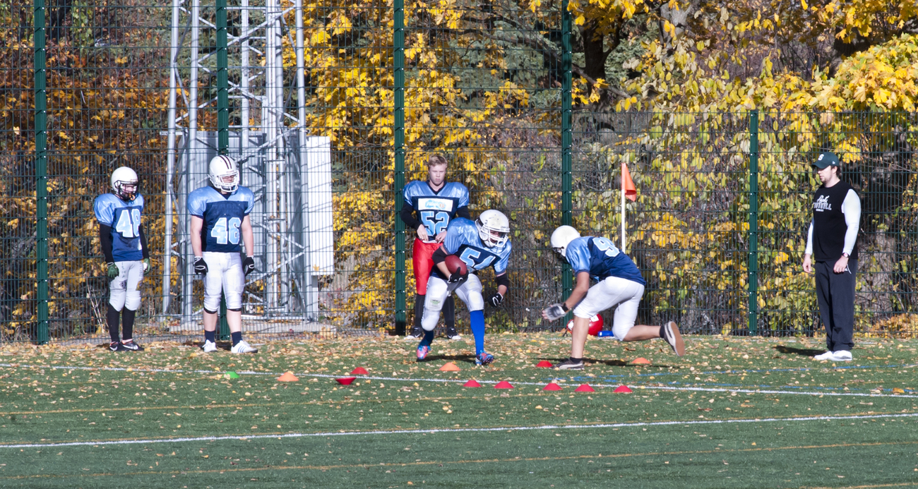 Kolme tuntia kestänyt harjoitus jakaantui seuraaviin jaksoihin: 13.00-13.20 pre practise - esiharjoituksessa hyökkäykset ja puolustus opettelevat harjoituksessa läpikäytäviä pelejä 13.20-13.35 warm up - aktivoiva alkulämmittely 13.35-14.15 indy - harjoittelu pelipaikkaryhmissä 14.15-14.40 1vs1 ja inside run - heittoharjoittelu 1 vs 1 ja 9vs7 juoksupeliharjoittelu 14.40-15.05 7vs7 ja pas pro - heittohyökkääminen ja puolustaminen takakenttäpelaajien kesken sekä linjojen heittosuojaus ja - rynnistäminen 15.05 team - koko joukkueen ottelutyylinen harjoittelu