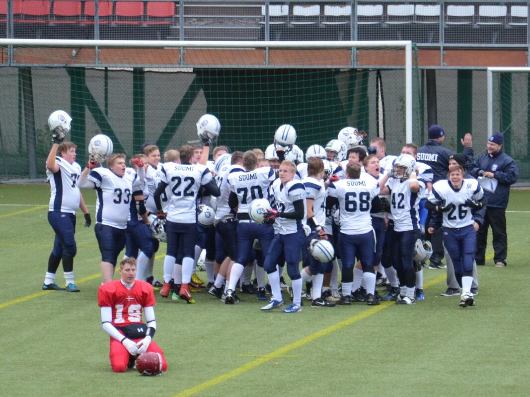 PM-kisojen avausottelussa Suomen ja Tanskan kakkosjoukkueilla oli tiukka ottelu, joka päättyi dramaattisen vaiheiden jälkeen Suomen voitoksi viime hetken heittomaalin ansiosta. Ottelu alkoi Tanskan lyhyellä potkulla. Luis Acao otti muutaman jaardin siivuja, mutta Suomi pakotettiin lentopotkaisemaan. Lentopotkun aloitussyöttö oli liian korkea ja Tanskan Andreas Ekelund pääsi lopulta tekemään irtopallosta maalin. Lisäpisteen onnistuessa Tanska johti 7-0. Fullback Toni Ahonen veti hyvällä rytinällä uudet yritykset. Luis Acao otti mahtavan kirmaisun ja eteni kolmenkymmentä jaardia. Suomi pääsikin 10 jaardin päähän maalista, mutta pelinrakentaja Kaarnakarin ja Acaon pallonvaihto epäonnistui ja Tanska piti maalialueensa puhtaana. Suomen puolustus piti hyvin ja Tanska oli pakotettu potkaisemaan. Suomi sai erinomaisen kenttäaseman puolestavälistä kenttää. Taftin Joni Lindholm kantoi lähes peräjälkeen palloa kuusi kertaa edeten 54 jaardia. Suomen linjassa oikealla puolella hankolaiskaksikko ja vasemmalla turkulaislinjamiehet. Joni Lindholm juoksi väkivahvasti 7 jaardia maaliin Vili Kujanpää veti hyviä blokkeja. Lindholm juoksi myös lisäpisteet Suomen mennessä johtoon 7-8. Tanska pääsi uusiin yrityksiin mutta hyvin joukkueena puolustanut Suomi piti jälleen puolensa. Hyvinkään Niklas Reinhardt taklasi. Tanskan hyvä onni jatkui ja se sai ilmaiseksi pallon Suomen rähmätessä pallon ensimmäisellä yrityksellään. Janne Sipilä pääsi vuorostaan irtopallon kaapimaan itselleen ja Suomi hyökkäsi uudelleen. Luis Acao oli pallonkantovuorossa ja hän käytti vikkelyyttään ja periksiantamatatonta pelityyliään hyväksi ja eteni kiertopeleillä. Tanska sai kolmannen turnoverin Micke Kaarnakarin heittäessä syötönkatkon. Suomen puolustus oli kuitenkin taas kärppänä peittämässä irtopalloa tällä kertaa Kuopion Kalle Tanninen peitti irtopallon. Luis Acao kiitti pallonkantovuorosta ja siivutti jälleen 8 jaardin verran palloa eteenpäin. Joni Linholm kävi ei suostunut kaatumaan ensimmäiseen iskuun ja Suomi toi palloa väljemmille vesille. Hyökkäysvuorossa ei kuitenkaan saatu uusia yrityksiä ja Tanska sai pallon kun pelipuoliskoa oli jäljelleä minuutti. Tanskan screeni alusti heittopelin, jossa Victor Stauning teki suomalaisten törmäillessä maalin. Rasmus Landbo potkaisi taukojohdoksi 14-8. Suomi menetti pallon kertaalleen aloituspotkussa ja Tanska pääsi kokeilemaan vielä kerran hyökkäystään. Jere Salejärvi taklasi ensimmäisen heiton ja toisen. Suomi menetti pallon neljästi ensimmäisellä jaksolla. Kolmannen jakson alku oli tasaista vääntöä. Suomi pysäytti Tanskan kahdesti. Suomi jakoi pelinrakentajavastuuta ja uusi pelinrakentaja Heikki Toivola onnistui heti heitossaan Niko Saarijärvelle. Hyökkäyksen koordinaattorina toiminut Aki Ollenberg jakoi pallonkantovastuuta Joni Lindholmin, Samu Teleniuksen sekä Luis Acaolle välillä. Suomi eteni kahden jaardin päähän maalista. Luis Acao kiitti kunniasta ja juoksi tilanteen tasanumeroihin 14-14. Suomen linja teki hyvää jälkeä ja Acao teki Suomen johtonumeroiksi 14-16 lisäpistejuoksullaan. Rasmus Pedersen nostatti Tanskan joukkoja ja purjehti 10 jaardin päähän pitkällä pallonkannollaan. Tanskan pelinrakentaja Emil Sörensen juoksi johtomaalin lähietäisyydeltä. Lisäpistepotku epäonnistui. Tanska johti kutkuttavasti 20-16. Suomi aloitti neljännellä jakson puolessavälissä ankaran takaa-ajon. Joni Lindholm jatkoi periksiantamatonta juoksuaan ja toi Suomen hyökkäystä eteenpäin kymmenen jaardin siivuilla. Luis Acao toi omat mausteensa otteluun, mutta pahaksi onnekseen menetti pallon tärkeässä paikassa. Tanska sai pallon ja aloitti hyökkäysvuoronsa. Team MVP Denmark DB Andreas Eklund