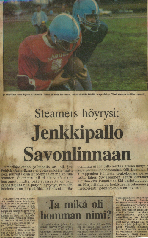 Kuopio Steelers ja Jyväskylä Jaguaarit tuovat kaupunkiin amerikkalaisen jalkapallon, jossa sitä edellisen kerran nähtiin 1981. Savonlinna Steamers pelasi muutaman vuoden SM-sarjassa. Savonlinnan Vappurähinäksi nimetyn jenkkifutispäivän aloittavat U17 nuorten ottelu 7vs7 SM-sarjan ottelu Kuopio Steelers ja Kotka Eagles klo 14.30. Tämän jälkeen Steelers pelaa harjoitusottelun Jyväskylän Jaguaareja vastaan klo 16.30.