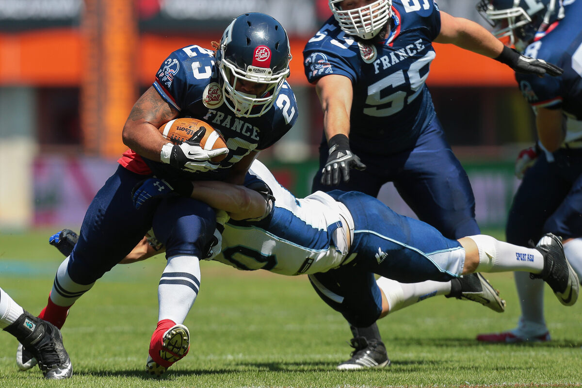 Suomi pelasi pronssipelissä Ranskaa vastaan Itävallan Wienissä käydyssä lopputurnauksessa. Suomen hyökkäyspeli alkoi hermoillen. Suomi sai kuitenkin syötönkatkon ensimmäisen neljänneksen alkuun, mistä pääsi etenemään maalipotkuetäisyydelle. Akseli Olinin yritys ei tuottanut toivottua tulosta. Neljänneksen ainut touchdown nähdään, kun Ranskan Stephen Yepmo ylittää maaliviivan lyhyellä juoksulla ja vie joukkueensa 7-0 johtoon ensimmäisen neljänneksen alkupuolella. Suomi aloittaa toisen neljänneksen aktiivisesti. Suomen kikkakuvio toimii, pelirankentaja Miro Kadmiry heittää Janne Lehtiselle, joka hakee pitkällä heitolla Ville Kurvisen. Kurvinen juoksee Suomen aina Ranskan 12 jaardin viivalle. Seuraava down ja Veikka Lehtonen kuljettaa pallon maaliviivan yli ja Olin potkaisee lisäpisteyrityksen sisään. Tilanne 7-7.Toisen neljänneksen puolivälissä, Suomen puolustus jättää ison aukon kentälle, minkä Ranskan Guillaume Rioux käyttää hyväkseen, juosten 45 jaardin juoksun. Ranskan toinen touchdown syntyy kun toista neljännestä on pelaamatta 1:14. Ranska saa vielä toisen neljänneksen loppuun syötönkatkon, mutta ei enää lähde hyökkäämään, vaan antaa pelikellon kulua loppuun. Puoliajalle mennään Ranskan johtaessa 14-7. Kolmas neljännes on Ranskan. Kaksi touchdownia vie joukkueen jo 28-7 johtoon. Päivän pisin heitto nähdään, kun Ranskan pelirakentaja Perez Mattison heittää 57 jaardia Guillaume Riouxille, joka juoksee taululle luvut 28-7, joista lähdetään ottelun viimeiselle neljännekselle. Lehtosen Veikka juoksee kolmannen neljänneksen lopussa Suomen hyviin asemiin ja heti viimeisen neljänneksen alkuun Miro Kadmiry löytää Kurvisen Villen, joka juoksee Suomelle päivän toisen touchdownin. Tilanne enää 28-14 Ranskalle. Ei kuitenkaan kestä kauaa, kun Ranska jatkaa menoaan. Anthony Dable vie Ranskan uusille kymmenluvulle touchdownillaan ja tilanne on 35-14. Viimeisillä minuuteilla Ranskalle sattuu päivän toinen rähmäys ja Suomi korjaa pallon. Suomen hyökkäysasemat ovat hyvät Ranskan 22 jaardin viivalta. Kadmiry löytää maalialueelta Aappo Salorannan, jonka hieno kiinniotto tuo Suomen lähemmäksi Ranskan pistetiliä, mutta kiri ei riitä. Tilanne 35-21 Ranskalle, mitkä jäävät myös ottelun loppulukemiksi. Ranska vie pronssimitalin, Suomen jäädessä turnauksessa neljänneksi. Suomen maajoukkueen päävalmentaja Tuoman Heikkinen oli ylpeä joukkueestaan, vaikka tulos ei ollut toivottu. - Nostan hattua pelaajillemme, moni pelasi ihan omalla huipputasollaan. Kaiken olisi pitänyt mennä nappiin, jotta olisimme voittaneet. Meiltä loppu puhti kesken pelin, mutta tulimme hyvin loppuun mukaan. - Ajanhallinnassa meillä oli vaikeuksia, niistä tosin ei voi syyttää pelaajia. Hieno peli, kaikki kunnia Ranskalle. Suomen parhaaksi pelaajaksi valittu Veikka Lehtonen sanoi kokemuksen pelata isolla stadionilla olleen mieleinen. - Hieno kokemus, hieno stadion, ilmapiiri ja ihmiset olivat fantastisia. Mitä muutakaan tässä voisi enää toivoa. Pettyneen oloinen Lehtonen huikkasi. |