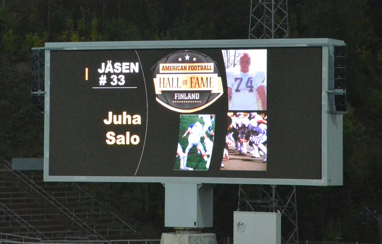 Vaahteramalja XLI:n puoliajalla julkistettiin Juha Salon ja Aarno Sjöblomin jäsenyydet. Katso hall of famereiden tarkemmat bio:t Hall of Fame sivustolta. Lyhyet videokoosteet Salon ja Sjöblomin pelaamisesta löytyvät täältä. SAJL Hall of Fame - jäsen #33 JUHA SALO 14 000 halukkaan joukosta kutsuttiin 710 pelaajaa World Leaguen leirille Floridaan helmikuussa 1991. "Jahu" Salo edusti Euroopan kärkeä hyökkäyslinjan ryhmässä ja hänet valittiin lopulta Sacramento Surgen ammattilaisjoukkueeseen. Salon tavaramerkkejä oli aggressiivinen juoksublokkaus sekä ohjuksenomaiset pitkä aloitussyötöt. Helsinkiläinen Salo edusti Suomea kolmissa EM-kisoissa ja pelasi avauskokoonpanon vasempana tacklena. Hän ehti kokeilemaan yliopistojalkapalloa Saddlebackissa Kaliforniassa. Uransa aikana Salo valittiin kolmesti all starsiin. Hän aloitti uransa 1984 Munkka Coltsissa ja päätti sen12 vuotta myöhemmin Helsinki Roostersissa.