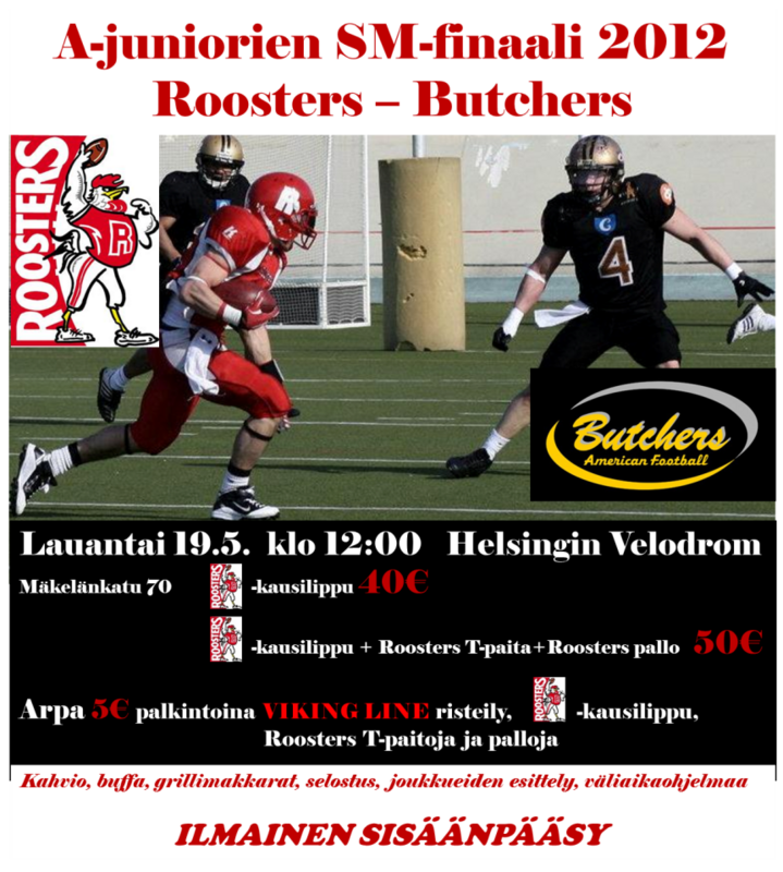 La 19.5. klo 12.00 potkaistaan huikea A-nuorten finaali käyntiin Velodromilla Helsinki Roostersin ja Porvoo Butchersin välillä. Seinäjoki Crocodiles sai pronssia. Joukkueiden runkosarjan kohtaamisessa Porvoo johti 0-14 puoliajalla, mutta Roosters kiri lopulta ohi voittaen ottelun 39-28 Henri Jussilan wildcat-hyökkäämisellä. Finaalissa joukkueiden kohtaaminen tulee olemaan kuitenkin erinäköinen jo sen vuoksi, että Roostersilla on käytettävissään molemmat pelinrakentajansa Otso Flinkman ja Nicholas Sandhu. Odotettavissa on kovatasoinen ottelu, jossa panosta riittää varmasti. Joukkueiden kokoonpanot ovat suunnilleen samat kuin alkukaudesta. Roostersin A-nuorista linjapuolustaja Antti Pirilä on loukkaantunut ja hänet korvaa paluun tehnyt Chris Mulumba. Helsinkiläisjoukkue pukee finaaliin yli 30 pelaajaa. Butchersin miehistö on kärsinyt alkukauden pienestä rosteristaan. Paluun tekee ainakin U17 maajoukkueen linjamies Eetu Rusanen. Porvoon rosterin koko on parikymmentä pelaajaa. Joukkueiden pelaajaaines on tasavahvaa. Molemmilla on ikäluokkansa parhaat pallonkantajat; helsinkiläisillä paljon suitsutettu Henri Jussila ja Butchersilla aina vaarallinen Micky Kyei. Joukkueet ovat kykeneviä myös näyttävään heittopelaamiseen. Tässä avaimeksi tulee muodostumaan heittoblokkaamisen varmuus. Porvoon Mikko Seppänen hakee heittopeleissä usein pitkiä ratkaisuja kerralla maaliin, kun taas Roosters luottaa enemmän keskipitkään systemaattisuuteen heitoissaan. Kuntopohja ratkaisee myös. Kumpi joukkueista jaksaa pelata yritykset loppuun; joukkuepuolustaa ja kirmata Velodromin ikinurmella viimeiseen vihellykseen asti. Onko Porvoon salainen finaaliase salibandyn nuorten maajoukkueessakin esiintynyt Deina Imjack? Tasaisissa otteluissa myös onnistuneet potkupelit voivat riittää mestaruuteen asti. Roostersin Onni Juvonen ja Butchersin Phung Ngyen ovat rutinoituja lisäpistepotkaisijoita. Löytyy jommaltakummalta varmuutta pidempiin pistepotkuihin. Finaalissa erityispaino on valmentajien onnistumisessa. Roostersin hyökkäystä koordinoi Atte Kniivilä ja puolustusta Juha Hakala. Porvoon ruorissa puolestaan ovat hyökkäyksessä Pekka Piminäinen ja puolustuksessa Tero Kontiainen. Velodromin ympäristössä tapahtuu lauantaina muutenkin, kun klo 13.00 Helsinki Wolverines avaa kautensa Velodromin harjoituskentällä Tampere Saintsia vastaan. Klo 16.00 I-divisioonan avausottelussa Velodromilla ovat sarjanousijat East City Giants ja Sipoo Bulldogs taistelevat pisteistä. Seinäjoki Crocodilesille SM-pronssia