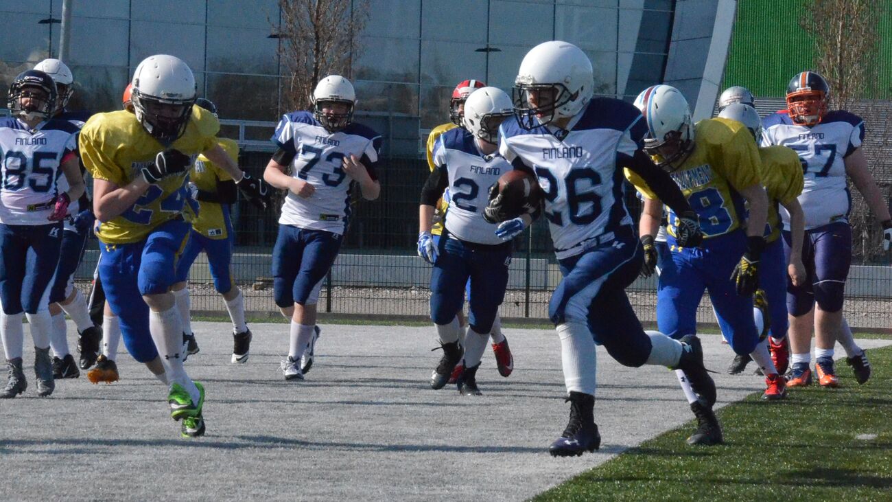 Suomen ja Ruotsin U15 kehitysjoukkueet leireilivät ja pelasivat yhdessä Velodromilla. Suomi oli scrimmagessa asteen edellä. Maajoukkueiden yhteinen leiritys oli ensimmäinen ikäkausimaajoukkueiden historiassa. Joukkueiden päävalmentajat Sebastian Brinkenfeldt ja Heikki Halttunen sopivat asiasta syksyllä 2014 Pohjoismaisessa nuorisotapaamisessa. Harjoitusten sisältö ja säännöt scrimmagea varten sovittiin yhdessä. Pelipaikkavalmentajat valmensivat osuutensa yhdessä ja 7vs7, inside run sekä pass pro -osuuksissa saatiin aikaan mahtavia sessioita, kun molemmilta joukkueilta löytyi tuoreita jalkoja ja kovaa yrittämistä. Leiripäivän aikana joukkueet lounastivat yhdessä ja lopulta koettelivat voimiaan scrimmage-pelissä. Suomella oli asettaa kolme tasavahvaa pelinrakentajaa pelikentälle. Heistä Antto Toivio toimitti juoksemalla itse pelivälineen 6 pisteen arvoisesti maalialueelle. Hienon heittohyökkäysvuoron esitti August Wahlstein, joka toi ryhmänsä Kristian Ristilän varmoilla kiinniotoilla läpi kentän. Jesper Korkalainen puolestaan pelasi varmasti ja näytti urheilullisuuttaan tekemällä muutaman nopean irtioton jaloillaan.