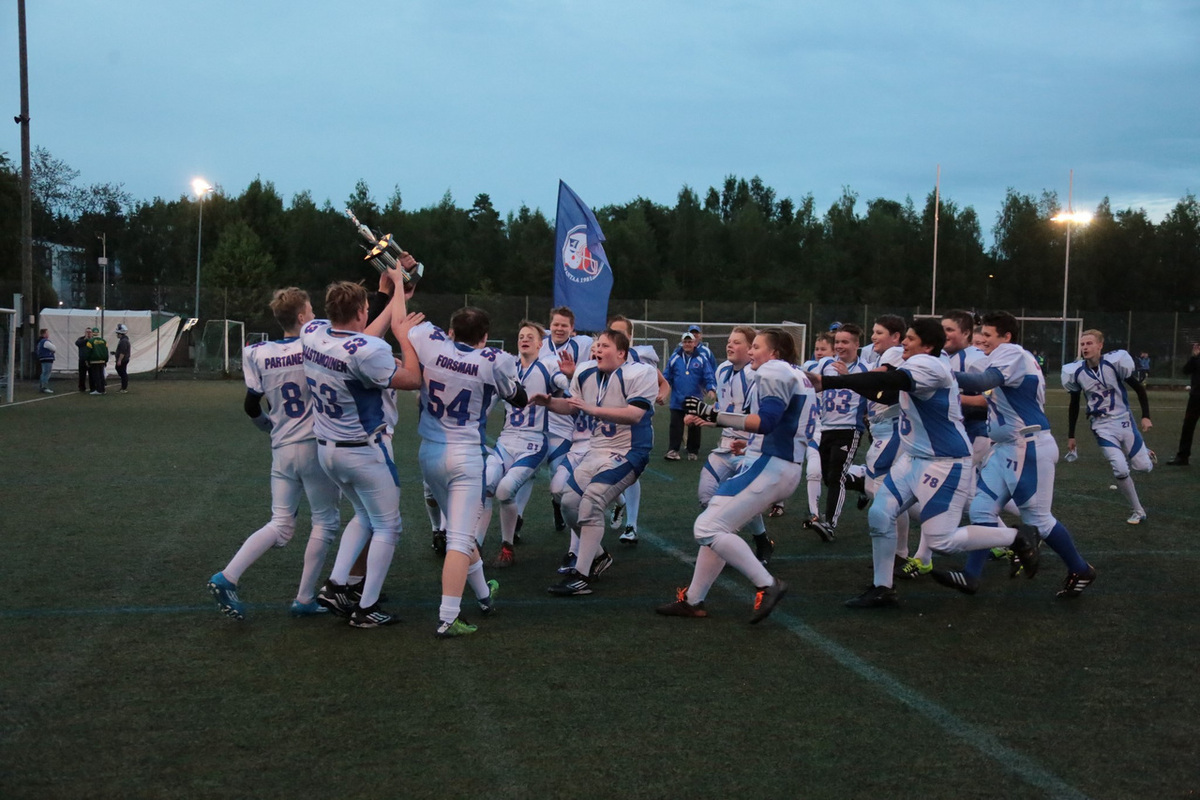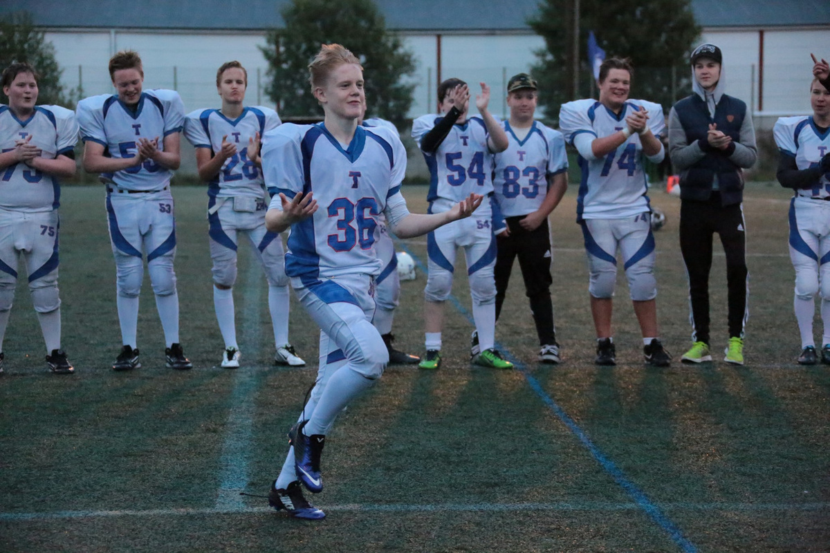 Pisteiden tekijät: 6-0 Viljo Lempinen 39 jaardin juoksu. Lisäpiste epäonnistui. 6-2 safety team Roosters 14-2 Santeri Lindfors 3 jaardin juoksu 20-2 Eetu Tuovinen 39 jaardin heittomaali. Lisäpistepotku epäonnistui. 28-2 Viljo Lempinen 32 jaardin juoksu . Antti Kekkonen lisäpistepotku 2p. 28-10 Vilho Paavilainen 79 jaardin heittomaali. Kim Saarijarvi lisäpistepotku 2p. 34-10 Derek Broman 1 jaardin juoksumaali. Lisäpisteheitto epäonnistui.