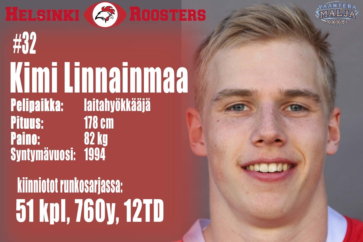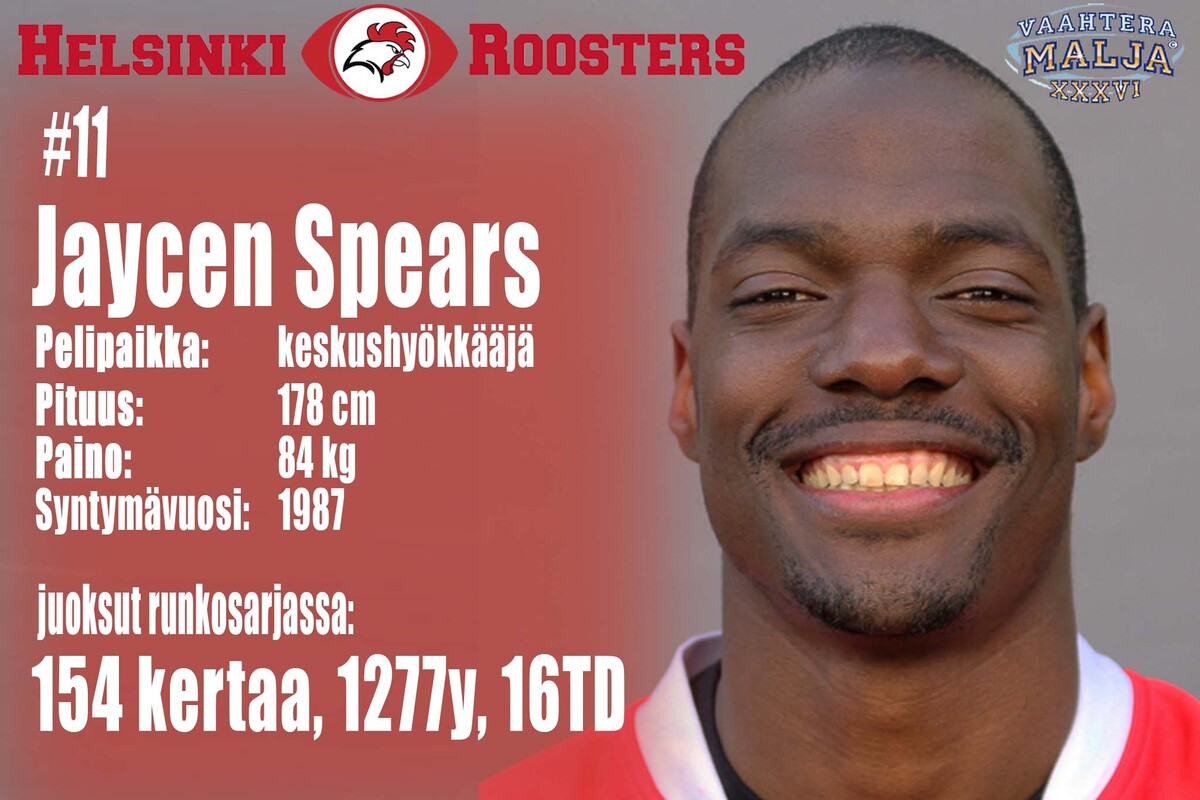 Roosters, hyökkäys: pelipaikka | # | | syntymä-vuosi | cm | kg | QB | 3 | Micah Brown | 1986 | 178 | 83 | RB | 11 | Jaycen Spears | 1987 | 178 | 84 | WR | 7 | Antti Miettinen | 1987 | 180 | 87 | WR | 9 | Bernard Luster | 1988 | 183 | 86 | WR | 32 | Kimi Linnainmaa | 1994 | 178 | 82 | WR | 83 | Markus Lievonen | 1991 | 183 | 80 | LT | 66 | Iiro Luoto | 1984 | 197 | 120 | LG | 54 | Mikko Toiminen | 1995 | 183 | 130 | C | 59 | Benjamin Watkins | 1990 | 185 | 120 | RG | 65 | Jere Lahti | 1996 | 186 | 123 | RT | 53 | Samuli Vehkomäki | 1996 | 186 | 103 |