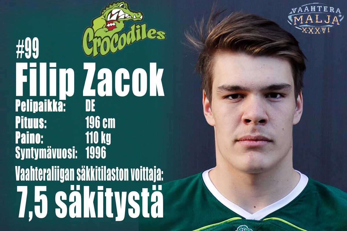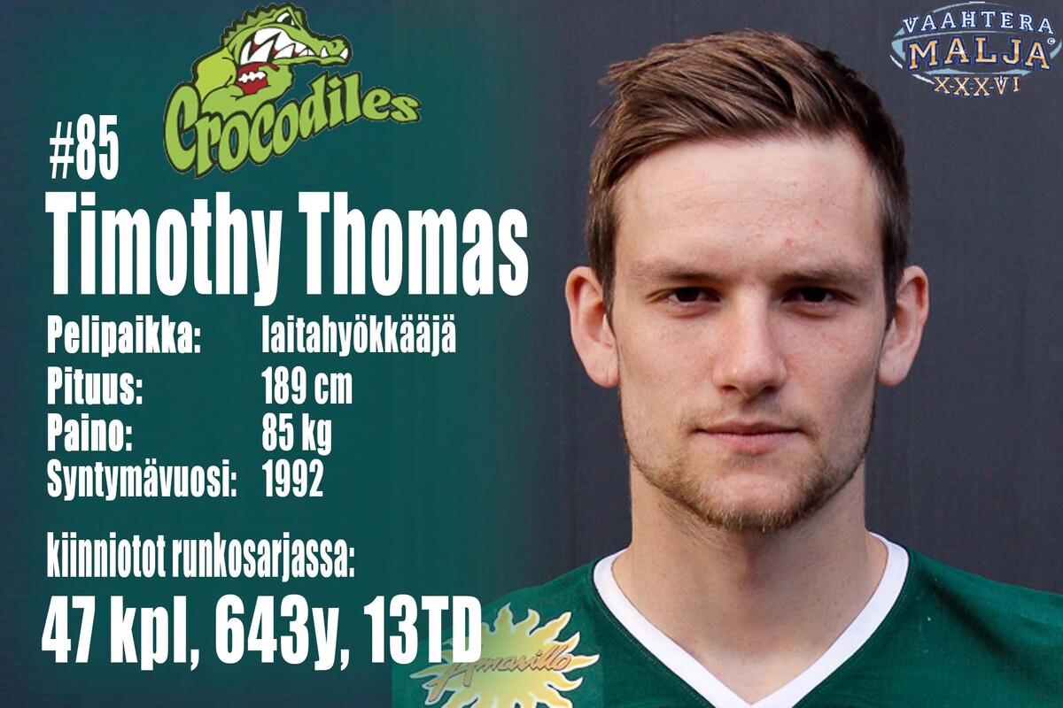 Crocodiles, puolustus: peli-paikka | # | | syntymä-vuosi | cm | kg | L DE | 45 | Olli Makkonen | 1986 | 189 | 119 | DT | 55 | Lane Stuht | 1991 | 186 | 122 | DT | 77 | Thomas Malagodi | 1993 | 196 | 128 | R DE | 99 | Filip Zacok | 1996 | 196 | 110 | SLB | 6 | Etienne Roudel | 1993 | 188 | 100 | MLB | 25 | Joni Virtanen | 1985 | 176 | 97 | WLB | 10 | Lauri Anttila | 1992 | 186 | 95 | L CB | 26 | Tuomas Leinonen | 1979 | 178 | 82 | SS | 43 | Juhani Koivumäki | 1991 | 178 | 93 | FS | 32 | Santeri Inkinen | 1991 | 179 | 90 | R CB | 21 | Yann Dika-Balotoken | 1993 | 170 | 77 |