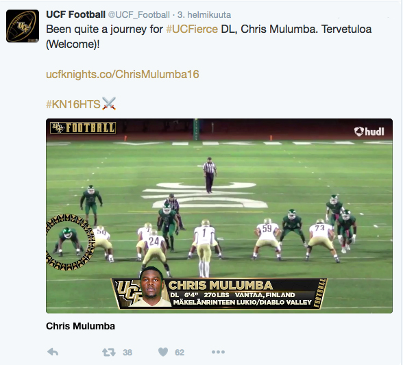 Puolustuksen linjamies pelaa kaksi viimeistä yliopistovuottaan korkeimmalla mahdollisella tasolla. Chris Mulumban, 23, hyvät otteet junior college -kentillä Diablo Valley Vikingsissa eivät ole lajin emämaassa jääneet huomaamatta. Parhaimmillaan 17 taklausta ottelua kohden kerännyt Mulumba valittiin joulukuussa ansaitusti Bay 6 –konferenssin tähtimiehistöön. Kalifornian junior collegen pelaajien eliittiin kuulumisella oli seurauksia. Yhteydenottoja I-divisioonan suurista yliopistoista tuli useita, ja neljään Mulumba kävi tutustumassa paikan päällä. Fresno State, Central Michigan ja New Mexico saivat kuitenkin jäädä, kun Mulumba helmikuun alussa kirjoitti sopimuksen University of Central Floridan (UCF) kanssa. – Ammattimaisuus, perustelee Mulumba lyhyesti valintaansa. – Kaikki on järjestetty viimeisen päälle niin akateemisesti kuin futiksenkin suhteen. Treeniolosuhteet Orlandon auringossa ovat maailman huippua. UCF osoitti neuvotteluissa haluavansa suomalaislinjamiehen joukkueeseensa. Mulumban uskotaankin ottavan nopeasti itselleen paikan joukkueesta, josta on noussut NFL:ään muun muassa tähtilaitahyökkääjä Brandon Marshall. Vuonna 2014 UCF eteni historialliseen Fiesta Bowl –voittoon. Tuolloin joukkuetta johtanut pelinrakentaja Blake Bortles valittiin myöhemmin keväällä NFL:n draft-tilaisuudessa ensimmäisen varauskierroksen 3. pelaajana Jacksonville Jaguarsiin, jossa toimii nykyisin aloittavana pelinrakentajana. – Minulla on vielä kaksi vuotta jäljellä yliopistossa. Olen todella innoissani mahdollisuudesta olla osa tätä joukkuetta ja haluan auttaa sitä nousemaan takaisin menestykseen ja bowl-peleihin. Mulumban (193cm/122kg) pääasiallinen pelipaikka on puolustuksen ulompi linjamies (DE) mutta voi tarvittaessa pelata myös linjan keskustassa. UCF:n puolustuksen linjan valmentajana kaudella 2016 aloittaa Mike Dawson, joka valmensi kaksi edellistä vuotta NFL-joukkue Philadelphia Eaglesin puolustuksen linjaa. Kilpailu peliajasta on rajua, mutta se ei Mulumbaa huoleta. – UCF:n rosterissa on tällä hetkellä 9 pelaajaa puolustuksen linjassa, ja nyt he signasivat 3 lisää. Kilpailu aloittavasta pelipaikasta tulee olemaan todella kova, mutta niinhän se on jokaisessa I-divisioonan koulussa, Mulumba kertoo.