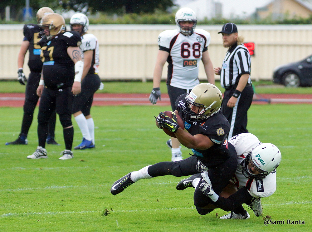 Kaksi laitahyökkääjää, kaksi erilaista polkua GFL-ammattilaiseksi – Tätä hetkeä olen odottanut siitä asti, kun aloitin pelaamisen, Micky Kyei tiivistää tuntemuksensa juuri solmitusta ammattilaissopimuksesta. Suomen maajoukkuepelaajat Kyei, 23, ja Sebastien Sagne, 22, pelaavat kaudella 2016 kovatasoisessa Saksan liigassa, GFL:ssä. Laitahyökkääjäkaksikko ja kaudella 2015 GFL:n välieriin asti yltänyt Dresden Monarchs tekivät kautta 2016 koskevan ammattilaissopimuksen maaliskuun alussa. – Monarchs oli ensimmäistä kertaa yhteydessä heti vuoden alussa, Sagne kertoo. – Annoin melkein heti myöntävän vastauksen. Dresden Monarchsilla on aiempaakin kokemusta suomalaispelaajista, sillä maajoukkueen hyökkäyksen linjamies Arttu Tennberg on pelannut kahteen otteeseen Elben jokilaaksossa lähellä Tsekin rajaa sijaitsevassa saksalaiskaupungissa. Tennberg oli mukana Monarchsissa vuosi sitten sekä vuonna 2013, jolloin Monarchs hävisi lopulta pisteellä loppuottelun. Australialaisen päävalmentajan John Leijtenin johdolla dresdeniläisjoukkue havittelee kaudella 2016 historiansa ensimmäistä GFL-voittoa.