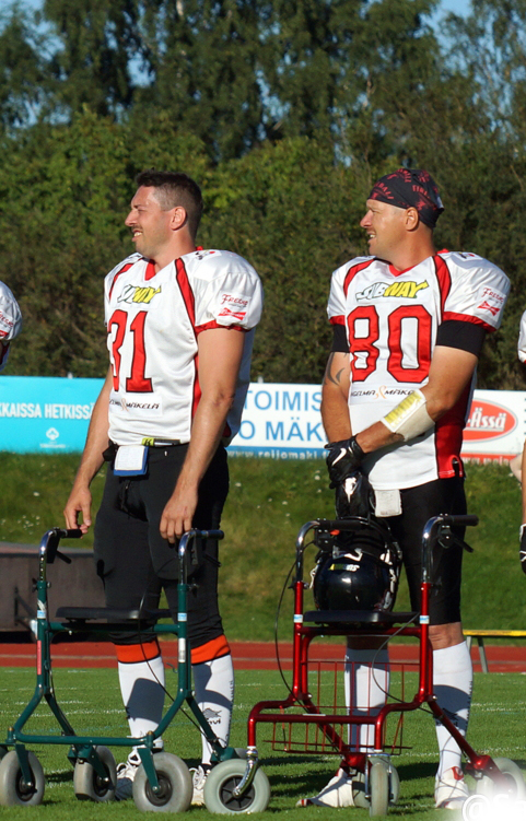 ![]() Niclas Carpelan (kesk.) jatkaa uraansa III-divisioonassa ja Kotka Eaglesissa. Jussi Kähönen (oik.) on kopannut pian 100 touchdownia Carpelanin heitoista. Myös Sin Thu on pelannut jo vuosia Carpelanin ja Kähösen kanssa. Kuva: FSC Media ![]() Kauden 2015 piti olla Carpelanille ja Jussi Kähöselle viimeinen. Spagettimaljaan kaksikko oli yhdessä muutaman muun veteraanipelaajan kanssa varustautunut eläköitymisen symbolein. Kuva: Sami Ranta |