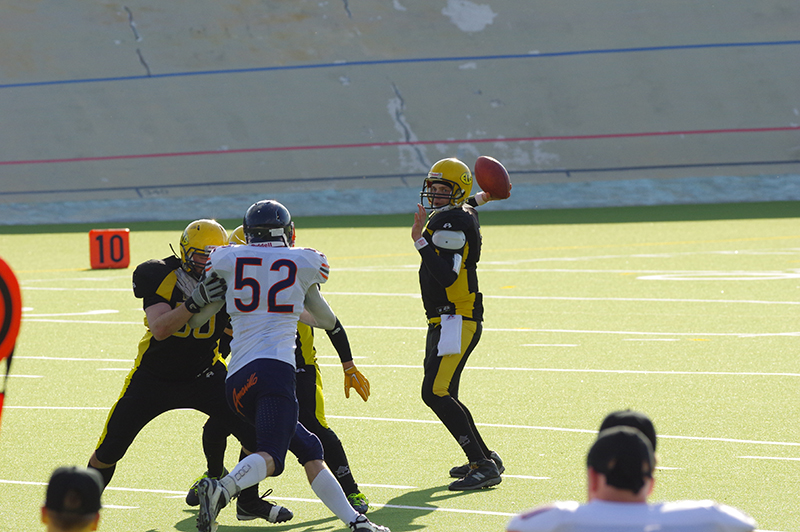 ![]() Nokia Ghosthuntersin nuori pelinrakentaja Thomas Salenius näytti lauantain ottelussa myös omaa juoksunopeuttaan. Päävastuun nokialaisten juoksupelistä kantoi kuitenkin tuttuun tapaan Tero Seppälä. Kuva: Hanko Sun City ![]() Pori Bearsin puolustuksen linjamies Joni Kotro oli lauantaina Velodromilla monessa mukana. Linjan päädystä vauhtiin lähtenyt Kotro (52) antoi toistuvasti painetta ECG:n pelinrakentajalle Niko Bredbackalle ja ehti taklaamaan myös laajalla säteellä juoksupeleihin. Kuva: ECG |