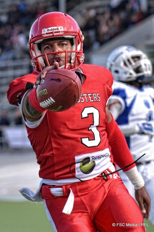 ![]() Pelinrakentaja Micah Brown palasi kentälle johtamaan Roostersin hyökkäystä. Brown juoksi ottelun avaus-touchdownin 50-jaardisella juoksulla, mutta heitoista onnistui perjantaina ainoastaan yksi. Toisella puoliajalla Brown katsoi Otso Flinkmanin pelaamista sivurajalta. Kuva: FSC Media |
