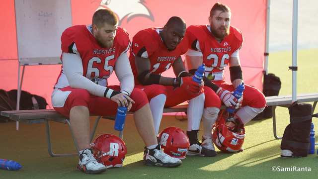 Roosters:| | | Hyökkäys: | | | | Puolustus: | | QB | 3 | Micah Brown | | DE | 62 | Ilari Nikku | | RB | 11 | Jaycen Spears | | DT | 99 | Roope Lindfors | | RB | 37 | Esa Vanhoja | | DE | 97 | Lauri Vainio | | WR | 2 | Bernard Luster | | LB | 35 | Miikka Kokkonen | | WR | 32 | Kimi Linnainmaa | | LB | 68 | Sebastian Karbin | | WR | 85 | Alexander Wasiljeff | | LB | 8 | Niko Kuikka | | LT | 66 | Iiro Luoto | | LB | 43 | Santtu Äyräväinen | | LG | 76 | Richard Laine | | CB | 33 | Ville Roitto | | C | 54 | Mikko Toiminen | | SS | 22 | Curtis Slater | | RG | 65 | Jere Lahti | | FS | 19 | Tuukka Hämäläinen | | RT | 53 | Samuli Vehkomäki | | CB | 4 | Pekka Rantala |
