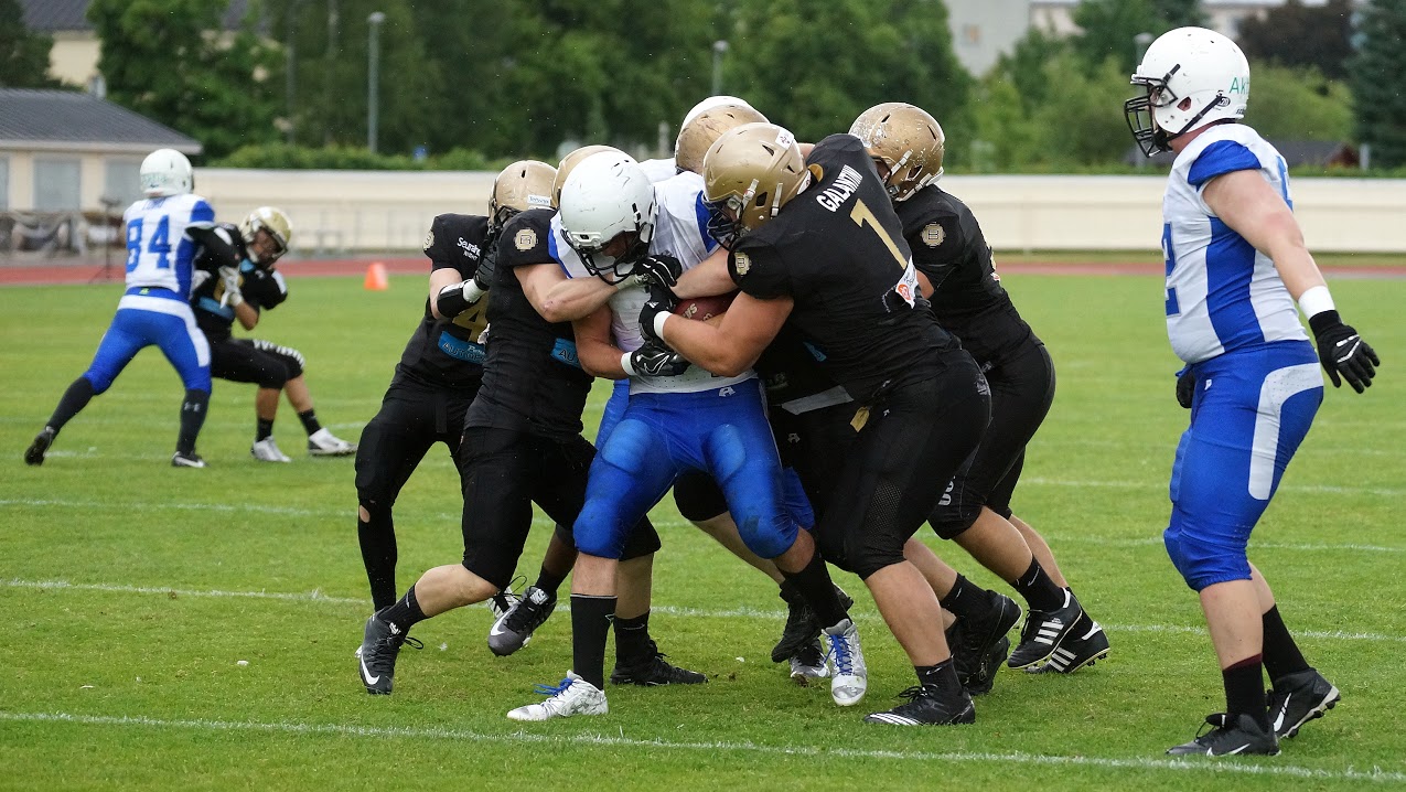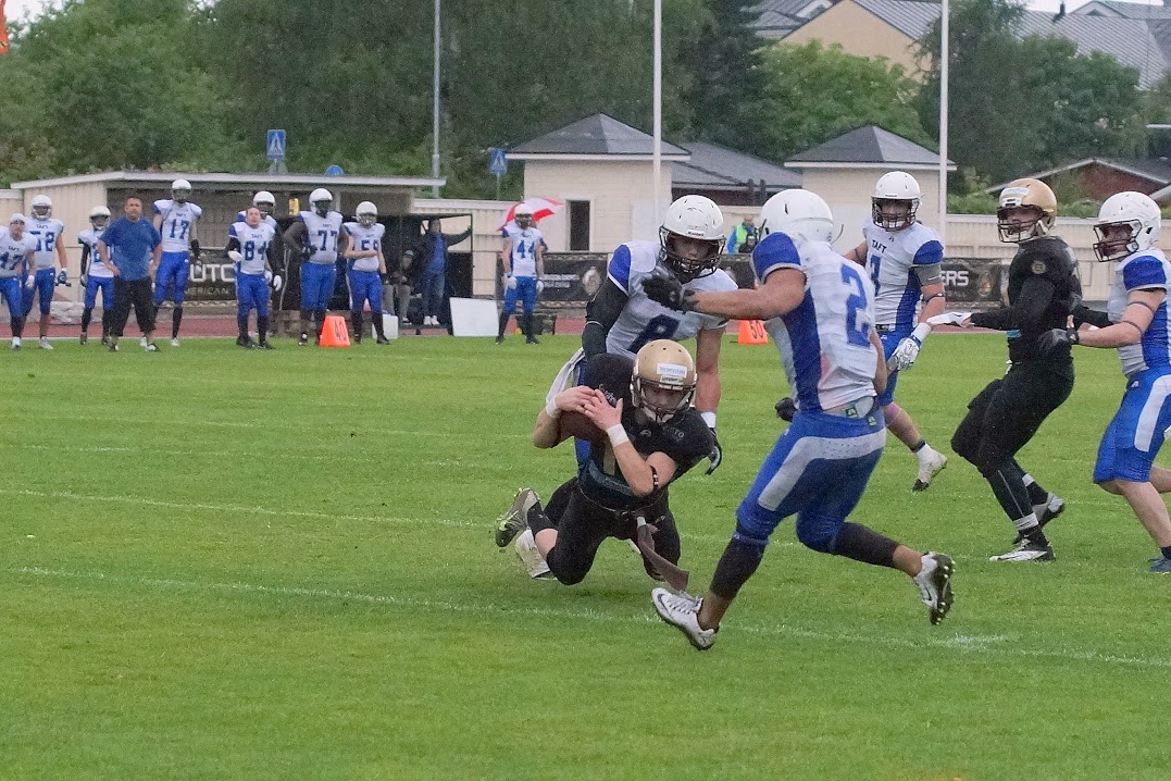 TAFT hallitsee palloa ja kelloa Puoliajalla TAFT sai pelisuunnitelmansa päivitettyä ja otti hallinnan itselleen. – Yksi ottelun ratkaisuista oli tapahtua siinä, kun hyökkäyksemme joutui palelemaan sivurajalla, Butchersin päävalmentaja Kari Leivoja tiivisti toisen puoliajan tarinan. Toisen neljänneksen jälkeen Porvoon Keskuskentän yläpuolinen taivas tummeni nopeasti ja muuttui voimakkaaksi kuurosateeksi, joka yltyi säännöllisesti läpi ottelun toisen puoliajan. TAFT kehitti rankkasateen keskellä yhden koko Vaahteraliigan alkukauden pisimmistä hyökkäysvuoroista. Yli yhdeksän minuuttia kestänyt hyökkäysvuoro sisälsi yhteensä 20 TAFT-yritystä, joista kuitenkin viimeinen oli epäonnistunut kenttäpotkumaaliyritys läheltä Butchersin maalialuetta. Puoliaika mukaan luettuna Butchersin pelinrakentaja Vasey ja muu porvoolaishyökkäys joutui olemaan pois kentältä yhteensä reilut 40 minuuttia. Kun Butchers ensimmäistä kertaa pääsi kentälle kolmannen puoliajan lopulla, esti TAFT-puolustus Jim Barryn johdolla kotijoukkueen etenemishaaveet. Jo kolmen yrityksen jälkeen Butchers joutui luopumaan pallosta TAFT:n hyväksi. Nuo kolme hyökkäysyritystä jäivät Butchersin ainoaksi kolmannella neljänneksellä, sillä Webb, Luiro, Still ja Sisler heittopelissä ja Andre Dahlman juosten pitivät pelikellon ja TAFT-hyökkäyksen käynnissä myös jatkossa. Kohtalo oli kuitenkin sama kuin edellisellä hyökkäysvuorolla: tällä kertaa kenttäpotkumaalin yritys päättyi Butchersin Jesse Vuoksenturjan blokkiin. Butchersin 10–7 -johto säilyi sitkeästi. – Koska emme saaneet hyökkäyksellä toisella puoliajalla mitään aikaiseksi, joutui puolustuksemme pelaamaan todella paljon. Tietysti se näkyi väsymisenä, Leivoja analysoi ottelun jälkeen. Pelikello kävi nopeasti kohti päätösminuutteja, mutta vielä kerran TAFT kehitti monipuolisen hyökkäysvuoron. Vantaalaisten päävalmentaja Stephen Stokes oli ensimmäisen puoliajan johtanut peliä ilman varusteita sivurajalla, mutta varsinkin päätösneljänneksellä Stokes oli kentällä lähes kaikkien yrityksien ajan ja valoi uskoa omiinsa. Lopulta TAFT onnistui murtamaan porvoolaisten maalilinjan, kun Barry siirtyi puolustuksesta keskushyökkääjäksi ja punnersi pallon kanssa touchdownin. Dahlmanin potkun onnistuttua TAFT johti 10–14. Aikaa oli jäljellä enää puolitoista minuuttia, kun Butchersin sateessa lähes koko toisen puoliajan seissyt hyökkäys tuli viimeistä kertaa kentälle. Vaseyn heitot Seppäselle ja Kemani Jonesin juoksut mahdollistivat porvoolaisten etenemisen iskuetäisyydelle. Lopulta vain 15 sekuntia ennen loppua Vasey tavoitti post-kuvion keskellä kenttää juosseen Seppäsen, joka sukelsi pallon perään ja tarttui pelivälineeseen juuri pallon ylittäessä maalilinjan. Luoman potkun myötä Butchers nousi 17–14 -johtoon. Lukemat säilyivät loppuun asti, sillä TAFT:n viimeinen hyökkäysvuoro päättyi syötönkatkoa heti ensimmäisellä yrityksellä. Webbin heiton pääsi katkaisemaan Seppänen, joka valittiin ansaitusti ottelun arvokkaimmaksi pelaajaksi. TAFT:n päävalmentaja Stokes oli ottelun jälkeen murheen murtama. – Ei meidän auta muuta kuin mennä eteenpäin. Kyllä se voitto vielä tulee, vaikka vaikeaa se tuntuu olevan, Stokes tyytyi toteamaan. Butchersin Leivoja oli tyytyväinen kahteen sarjapisteeseen - ei muuhun. – Saimme kaksi pistettä ja hyvä niin, Butchers-valmentaja sanoi. Butchersin kausi jatkuu jo tiistaina, jolloin Butchers pelaa kotikentällään Tampere Saintsia vastaan. TAFT puolestaan lähtee juhannustauolle ilman voittoja. Vaahteraliigaa pelataan kuitenkin vielä ennen tiistain Butchers–Saints –ottelua. Sunnuntaina Turussa kohtaavat Anders Trojans sekä Seinäjoki Crocodiles.