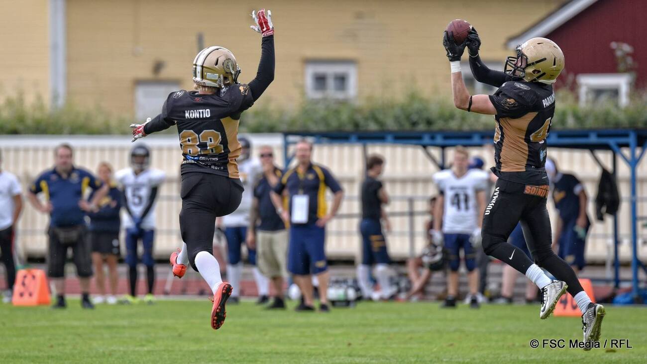 ![]() Ottelun parhaan palkittu Daniel Luoma teki heittopeleistä kaksi touchdownia ja potki lisäksi viisi lisäpistettä. Kuva: FSC Media / Riku Flink ![]() Joukkueiden parhaimpiin kuuluivat lauantaina Butchersin keskushyökkääjä Kristian Metsämäki sekä Wolverinesin ahkerin taklaaja Aleksi Kylli. Kuva: FSC Media / Riku Flink ![]() Rasmus Kontio (vas.) näyttää suuntaa, kun Jere Paananen on ottanut yhden kolmesta syötönkatkostaan. Kuva: FSC Media / Riku Flink |
