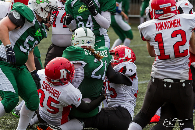 Trojans selvitti poikkeuspelilläkin itsensä finaaliinKun Roosters ja Valkyries olivat kohdanneet viikko aiemmin, iski Trojans pisteitä terävällä heittopelillä ja käytti yhdysvaltalaispelaaja Lea Kaszasia ainoastaan puolustuksessa. Viikossa tilanne oli kuitenkin turkulaisten osalta muuttunut radikaalisti, mutta siitä huolimatta Trojans otti voiton selvin lukemin. Suurin muutos Trojansin pelissä liittyi pelinrakentajan tehtäviin. Jonna Hakkarainen ei pelannut ensimmäisellä puoliajalla lainkaan, vaan pelinrakentajana toimi Kaszas. Normaalin rytmin rikkoutuminen näkyi pelien onnistumisessa ja Valkyries saikin pidettyä Trojansin vaarallisimmat aseet pois. Kerran Kaszas kuitenkin pääsi maalintekoon ja juoksi ottelun taukolukemiksi 6–0. Toisella puoliajalla Hakkarainen pelasi turkulaisten pelinrakentajana, mutta Trojans ei nytkään käyttänyt juuri lainkaan heittopeliä. Sen sijaan Kaszas siirtyi keskushyökkääjäksi, mikä tuottikin tarvittavan tuloksen yhdysvaltalaisen juostessa kolme touchdownia lisää. Iltapäivän komeimmasta osumasta vastasi Jutta Luhtala, joka käänsi neljännen yrityksen lentopotkupelin omaksi juoksuksi ja kuljetti pallon yli 70 jaardin päästä maaliin. – Meillä on aina vihreä valo, jos lentopotkaisija näkee tyhjää tilaa, Trojansin päävalmentaja Miko Ylikoski kommentoi Luhtalan juoksua. Luhtala teki lisäksi kerran kaksi pistettä lisäpistepelissä. Myös toinen Trojansin USA-pelaajista, Elise Stephens onnistui kahden pisteen lisäpistesuorituksessa. Trojans on kauden aikana kärsinyt ainoastaan yhden tappion - tulevalle finaalivastustajalle Roostersille. – Meillä on älyttömän hyvä tunne joukkueessa. Spirittiä ja fiilistä pitää melkein rauhoitella, Ylikoski sanoo. – Odotamme revanssia todella paljon. Katso myös:
