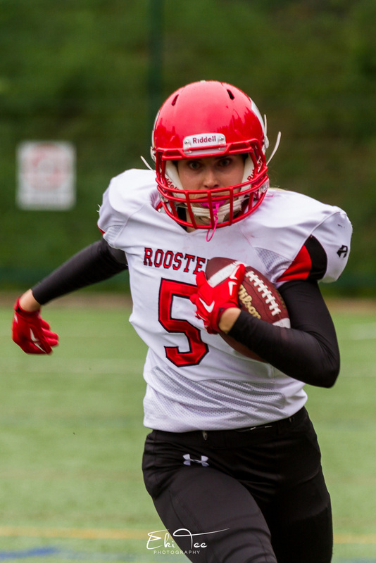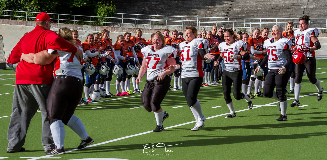 ![]() Roostersin hyökkäyksen linja valittiin ottelun arvokkaimmaksi "pelaajaksi" kesäkuussa Oulu Northern Lightsia vastaan pelatussa ottelussa. Kuva: Eki Tanskanen ![]() Multipelaaja Janina Virtanen on pelannut kauden aikana useita pelipaikkoja - myös pelinrakentajana - mutta Roostersin #5 kohtaa finaalissa viimevuotisen seuransa erityisesti laitahyökkääjänä. Kuva: Eki Tanskanen ![]() Roosters-kapteenisto: Sanna Virtanen (QB #4), Anna Tanskanen (LB #11), Sari Kuosmanen (WR/FS #81) ja Jenni Lindén (RB #2). Kuva: Eki Tanskanen ![]() Roosters-puolustus on ollut kauden aikana armoton vastustajien hyökkäyksille. Helsinkiläiset olivat ykkösiä niin päästyissä, pisteissä kuin päästetyissä heitto- ja juoksujaardeissakin. Finaalissa vastassa oleva Trojans puolestaan oli kaikissa vastaavissa hyökkäystilastoissa Naisten Vaahteraliigan kärkijoukkue. Kuva: Eki Tanskanen |