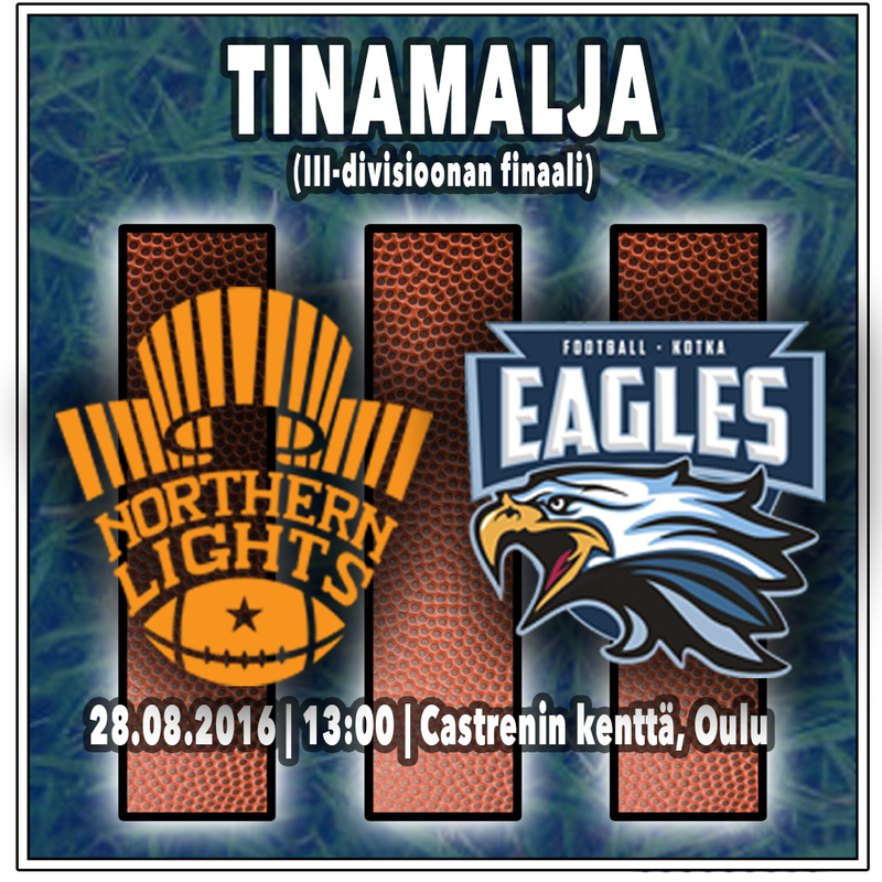 III-divisioonan loppuottelusta tarjolla live-stream kello 13.00 alkaen III-divisioonan loppuottelussa eli Tinamaljassa kohtaavat sunnuntaina Oulussa Northern Lights sekä Kotka Eagles. Ottelu alkaa Castrénin kentällä kello 13, ja ottelusta on tarjolla myös Northern Lightsin tuottama live-stream. Finaalissa kohtaavat runkosarjassa sijoille yksi ja kaksi sijoittuneet joukkueet. Kumpikin voitti kauden kahdeksasta ottelustaan seitsemän ja joukkueet sijoittuivat näin ollen tasapisteisiin. Ratkaiseva ero oululaisten hyväksi syntyi keskinäisestä ottelusta - sekin niukasti. Toukokuussa Oulussa pelatussa pisteiloittelussa Northern Lights oli parempi lukemin 54–52. Oulussa ei ole voitu elokuun osalta puhua otteluruuhkasta, sillä Northern Lights on pelannut ainoastaan kerran kuluvan kuukauden aikana. Tuo ottelu oli viikko sitten pelattu välierä Lohja Lionsia vastaan, jonka Lights voitti lukemin 12–7. Kotijoukkueen peli-identitetti on Tinamaljaan tultaessa vahvistunut: lahjakkaat nuoret hyökkääjät, kuten Othman Al-Kubaisi, Aku Uotila, Saku Kuusiniva ja Aleksi Statsevich kuuluvat sarjan tehokkaimpaan osastoon ja pystyvät hyökkäämään niin maata kuin ilmaakin pitkin. – Välierässä meidän vahvuutemme oli kuitenkin puolustus, joka onnistui riistämään pallon kolmesti ja oli vahva erityisesti maalialueiden läheisyydessä, kertoo Northern Lightsin Joonas Taina. – Suurin syy puolustuksen vahvistumiseen on ollut ilman muuta Tim Johnson. Suomeen ensimmäistä kertaa jo 1980–luvulla saapunut yhdysvaltalainen Johnson palasi keväällä vuosien tauon jälkeen oranssipaitojen sivurajalle ja aloitti työnsä kauden ensimmäisestä ottelusta Eaglesia vastaan. Ottelusta, jossa sunnuntain finaalivastustaja teki 52 pistettä ja eteni noin 600 jaardia. Nyt Johnson on jo palannut kotimaahansa, mutta vaikutus yltää varmasti myös finaaliin. – Tärkeintä on saada pysäytettyä Nesin (Eagles-pelinrakentaja Niclas Carpelanin) heitot, Taina kertoo. – Hävisimme runkosarjassa ainoastaan Wolverinesille, jossa Robert Johnson heitti melkoisen tarkkoja palloja. Uskon, että se on tapa, jolla myös Kotka tulee meitä haastamaan.