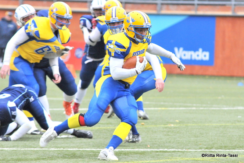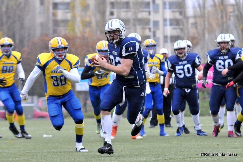 Team Finland snatched the gold from team Sweden in the Nordic Championships final 2016 @Myyrmäki urheilupuisto arena Team Finland are Nordic Champions 2016 after using a dominant defensive performance to topple the Swedish offense, 30 – 14. Both teams played high-class football and the final game offered breath taking moments to the crowd. In the first half both teams shined in defensive plays and forward moving was quite difficult for both offenses. Sweden played tough defense and it succeeded to minimize the Finns offensive progress well. The lion defense showed also their claws in the first half and it didn’t make the Swedish running back Vilinhton Tengroths day an easy one. Although both teams defenses were in the spotlight in the first half, the offenses flashed some big highlight moment plays. Daniel Luoma 35 yard field goal and Juhani Veijula touchdown reception put the Finns in lead. The Swedish team didn’t leave the first half without scoring. The Swedish thunder thigh Vilinhton Tengroth slipped past from the lion defense and stopped in the end zone. After first half the score was 10 – 7 for the Finns. In the second half the Finnish offense started to fly The second half of the game the two teams played the most physical football in the tournament. The Swedish offense jumps to a fast start in 3rd quarter. Running back Vilinhton Tengroth blasted away an 80 yard run from the Finns defense and gave Sweden four point lead ( 10 – 14 ) . The Finns offense got themselves together very fast and punched three touchdowns, ( rushing, receiving and rushing) getting the lead ( 30 – 14 ) back. When the Finnish defense succeeded to close team Sweden’s offensive progress in the end of the second half, the Swedish team ran out of ideas how to brake the lion spirit. Team Finland kept the lead safely and snatched the gold from team Sweden in the Nordic Championships final 2016 30 – 14. Finland managed to squeeze a huge victory over Sweden with great teamwork - I feel great, we had a great team victory, we fought hard and we just kept going and we knew we were going to beat them. I think it was the atmosphere we had in the sidelines and on the field and we just never gave up, says the game MVP Markus Haapasaari when asked the reasons for the huge win. - Well it was as tough, physical and cold as expected so it was everything we were getting ready for. Team Sweden was physical and they were big. They know how to play, says Team Finland’s headcoach Tero Virtanen during postgame press conference. |