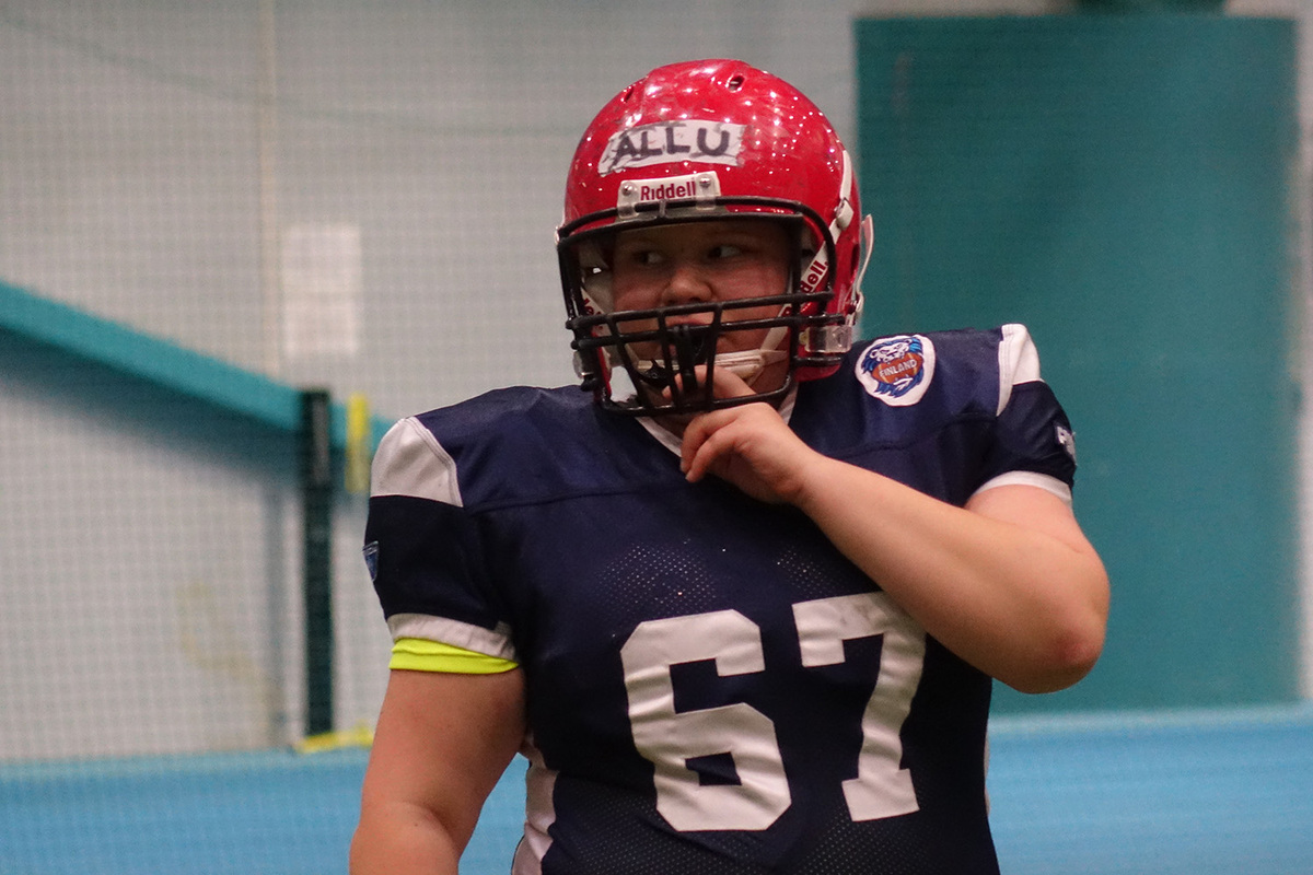 Puolustuksen koordinaattori Heli Harjanne: "Ainakin kovuutta löytyy." Naisten U19-maajoukkue harjoitteli viikonloppuna intensiivisesti pelikirjaa ja pelipaikkakohtaisia tekniikoita. Vaikka pelikirjan teoriaosuus ja kuviot olikin annettu kotitehtäväksi jo etukäteen, sai päävalmentaja Jan Österlundin valmennusryhmä todistaa valtavia kehitysaskelia myös leirillä vietetyn vajaan 36 tunnin aikana. Sunnuntai-iltapäivän scrimmage-harjoittelussa pelikirjan kuviot muuttuivat täysivauhtiseksi tekemiseksi, jota valmentajat tarkkailivat tyytyväisinä. – Leiri täytti kaikki odotukset, toteaa puolustuksen koordinaattori Heli Harjanne. – Ensimmäinen tavoite oli se, että saamme paikalle niin paljon pelaajia, että scrimmage on mahdollista. Se täyttyi. – Toinen tavoite oli se, että paikalla olevat pelaajat pystyvät toteuttamaan pelisuunnitelmaa. Se täyttyi loistavasti. Pelasimme hyvällä kontaktilla, hyvällä sykkeellä. Pelaamisessa ei ollut minkäänlaista arkuutta - päin vastoin kovuutta löytyy. Huomaa, että moni on päässyt pelaamaan aikaisemmin muun muassa poikien joukkueissa. Yhdeksi tulevaisuuden kivijalaksi Harjanne nostaa linjapelaamisen. – Meillä on monia hyviä ja vahvoja 15–16 -vuotiaita linjapelaajia, jotka pelaavat hyvällä linja-asenteella. Peli rakentuu linjan päälle, joten tämän päälle meidän hyvä kehittää peliä. Harjanteen mukaan leirille osallistunut noin 25 pelaajan ryhmä muodostaa 19-vuotiaiden naisten maajoukkueringin. Varsinaisesta joukkueen kokoamisesta ei leirillä vielä puhuttu. – Maajoukkuevalintojen aika on vasta kaukana edessä. Nyt tärkeintä on, että saamme kaikki tähän ikäluokkaan kuuluvat pelaajat tavoitettua ja mukaan leirille. – Yksi tämänkaltaisen harjoittelun eduista on se, että jokainen saa pelata juuri sitä pelipaikkaa, jota seurajoukkueessakin haluaa pelata. Monesti pelaaja harjoittelee sekä hyökkäyksessä että puolustuksessa, vaikka ensisijaisesti haluaa pelata vain toisella puolella palloa. Pelikirjan strateginen osuus - eli niinsanotut X:t ja O:t - loksahtivat Pajulahden leirillä kohdalleen ja Harjanne myöntää tilanteen olevan jo ensimmäisen pelikirjaleirin jälkeen hyvä. – Pelasimme 3-5 -fronttia ja siitä peitto ykköstä, Harjanne avaa. – Lisäksi ajoimme sisään blitz-paketin ja sopeutukset motioneihin. – Keväällä on sitten luvassa aluepuolustus, Harjanne jatkaa. Naisten U19-maajoukkueen seuraava maajoukkueleiri on siis luvassa vuoden 2017 puolella. Kaiken kaikkiaan tilanne vaikuttaa Suomessa 19-vuotiaiden ikäluokassa erittäin lupaavalta.