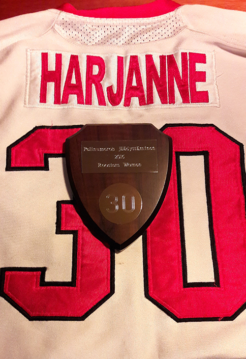 Menestystä ympäri maailmanBruun ja Eveliina Pulli olivat siirtyneet 69ersista kaudelle 2002 Helsinki Roostersin joukkueeseen ja loppukaudesta saivat houkuteltua myös Harjanteen mukaan. Tuosta hetkestä käynnistyi noin 14 vuoden mittainen yhteys helsinkiläisjoukkueen ja Harjanteen välillä. Säännöllisesti Harjanne huomasi aina palaavansa takaisin punaiseen paitaan. Viisi seuraavaa vuotta toivat myös menestystä. Vuonna 2007 Harjanne jäi syrjään voitettuaan kaksi edellistä Suomen mestaruutta, Euroopan mestaruuden ja MM-pronssia. – Työt veivät maailmalle, Harjanne muistelee. – Olin ensin puoli vuotta Ostravassa Tsekissä ja sitten kaksi vuotta Oslossa. Sillä aikaa, kun Harjanne oli ulkomailla, siirryttiin Suomessa semikontakti-pelimuodosta "oikeaan" jenkkifutikseen. Ennakkoluuloton Harjanne pääsi kuitenkin lajin pariin jo Norjassa ollessaan. – Norjassa ei vuonna 2009 ollut naisten joukkueita, joten harjoittelin ja myöhemmin myös pelasin poikien U16-joukkueessa. Opin kovuutta ja olin voittamassa myös Norjan mestaruutta Oslo Vikingsissä.