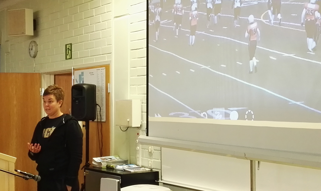 Päivän ensimmäinen luennoitsija Mikkelin Ammattikorkeakoulu fysioterapiaopiskelija Sanni Asikainen esitteli opinnäytetyötään, jonka aiheena oli liikkuvuusharjoittelun ja lapatuen hallinnan merkitys jenkkifutarin olkapäävammojen ennaltaehkäisyssä. Opinnäytetyön avulla on tuotettu opas amerikkalaisen jalkapallon pelaajille ja valmentajille. Olkapäävammoja voidaan ennaltaehkäistä. Harjoitteissa tulee olkapään alueen lisäksi huomioida vartalon asento, yläselkä, rintakehä ja hartiarengas. Heikkoja olkapään alueen lihaksia pitää vahvistaa ja vastaavasti kireiden lihasten elastisuutta pitää edistää. Dynaaminen alkulämmittely ja loppujäähdyttely käyttöön aina treenien ja pelien yhteydessä. Oikeankokoiset hartiasuojat sekä oikeaoppiset tekniikat ovat olennaisissa rooleissa. Kaatumista pitäisi harjoitella myös, sillä näissä tilanteissa aiheutuu olkapäävammoja yllättävän usein. Voidaan arvioida, että melkoisella todennäköisyydellä useat olkapäävammat tulevat otteluiden loppuvaiheissa kun keskittyminen herpaantuu ja ja oikeaoppisten tekniikoiden käyttö vähenee. Selkeästi kuvitettu opas toimii mainiosti jumppaohjeineen olkapäävammojen ennaltaehkäisyn oppaana pelaajille ja valmentajille. Opi Olavuon matkaraportti toi esille kuinka intensiteetti ja raivokas yrittäminen ovat isoissa rooleissa high school joukkueen harjoittelussa. Olavuon kohteena olleessa Somerset Berkley Regional high schoolissa ykköslaji on amerikkainen jalkapallo. Harjoituksissa Blue Raidersin pelaajia juoksutetaan viimeiseen pillinvihellykseen asti tarkoituksena nostaa kuntopohjaa sellaiseksi, että keskittyminen on kasassa vielä otteluiden viimeisellä neljänneksellä. Tämä aloitetaan elokuun alun leirillä, jolloin neljän tunnin harjoituksia on kuutena päivänä viikossa. Harjoitukset päättyivät aina ylämäkijuoksuihin. Olavuo näkikin, että Somerset Berkleyn urheilemisen kokonaiskuvassa urheilijoiden palautuminen on suhteellisen tuntematon tekijä. Puitteet urheilemiseen seitsemän valmentajan valvovien silmien alla ovat mainiot. High school -valmentajat tekevät myös opetustyötä ja sitä kautta oppivat tuntemaan pelaajiston hyvin. Jalkapallon valmentaminen perustuu paljon vallalla olevaan perinteeseen ja valmentajakulttuuriin. Yhteishenki on voimakas ja sitä ruokitaan monin tavoin. Joukkueen pelaajien äitien valmistamat team dinnerit ovat isoja tapahtumia. Suomalainen linjapuolustaja Aleksi Olavuo on yksi Blue Raiders -joukkueen 16 avainpelaajista, jotka periaatteessa kaikki pelaavat kahteen suuntaan. Hyvin sujuneen jalkapallokauden jälkeen Olavuo jatkaa yleisurheilun parissa kuulantyönnössä. Stefan ”Eti” Karkulahdella on käynnistymässä 39. kausi lajin parissa. Valmentajapäivän esityksessä hän peräänkuulutti tehokasta harjoittelua ja lajin opettelua jossa karsitaan turhat asiat pois ja keskitytään olennaiseen. Karkulahti näkee liian paljon jenkkifutisharjoittelussa ensin seisomista isossa ryhmässä ja sen joukkueen jakaannuttua sama seisomisen teema jatkuu pienemmissä ryhmissä. Kadettikoulun korkekoulujoukkueen Black Knightsin harjoituksissa perinteinen lämmittelyosuus on jätetty pois ja urheilijat hakevat lämmön suoraan lajitreenin toistoilla. Vähäinen harjoitusaika käytetään tarkasti ja esimerkiksi laitahyökkääjien kuvioiden juokseminen on pienessä roolissa ja painopiste on kiinniottoharjoitteissa. Amerikkalaisen jalkapallossa kontaktiasennon tulisi olla hyvin matala. Tällöin lantion käyttö mahdollistuu paremmin. Karkulahti pitää esimerkiksi Heads Up Footballin taklaus- ja blokkausharjoittelua tätä tukevana. Mestarillinen harjoitus tekee mestarin, ei pelkästää valtava harjoitteluaika – toteaa valmentajakonkari lopuksi. Kolmatta vuotta Roostersin naisten puolustuksen koordinaattorina toimiva Heli Harjanne esitteli valmentajan visiotaan - puolustuksen konsepti 2015-2017. Intohimolähtöisen vision voi jäsennellä järkeväksi ja hallittavaksi kokonaisuudeksi. Visio keskittyy teemoihin, joita ennen ja jälkeen kauden tarkastellaan aina uudestaan. Aihekokonaisuuksia Harjanteen puolustuskonseptissa ovat mm. pursuit, taklausvarmuus, fyysinen kunto, monipuoliset pelaajat, aggressiivisuus, kurinalaisuus. Esimerkiksi tavoitteena kirjattu pallon riistot osana pursuitia eivät ole vielä ajankohtaisia tässä vaiheessa. Puolustuksen keskeisiä teemoja ovat myös taklaustuntuman ylläpito. Joukkue käyttää tackle tube -apuvälineitä puolustustekniikoiden harjoittamisen lisäksi esimerkiksi blitzaamisen, eri blokkien. Roostersin konseptissa aggressiivisuus tarkoittaa mm tapaa hyökätä palloa kohti, turn overeitten aikaasaamista ja paineen aikaansaamiseen pelinrakentajaa kohtaan. Pelaamisen kovuuden taso asetetaan pelille ja siihen sopeutuaan. Kovuus määritellään myös tuntemuksena. Joukkueessa pelaavaan kokoonpanoon pääsemisen edellytys on omaksua yhteinen konsepti ja noudattaa sitä. Kauden 2015 slogan oli – kovuus pitää kokea. Harjanne haastoi esityksensä lopuksi valmentajapäivän osallistujat ottamaan sloganit käyttöön omassa joukkueessaan. Jyrki Lempinen kertoi päivän päätteeksi ohjauksellisen käsikirjan - opiskelu ja amerikkalaisen jalkapallon pelaaminen Pohjois-Amerikassa - keskeisistä sisällöistä. Opinnäytetyö on tehty SAJL:n tilaamana liittyen Lempisen opinto-ohjaajan opintoihin Jyväskylän ammattikorkeakoulussa. Lempinen kävi ohjauskeskustelun yhdeksän nuorten maajoukkuetasoisen lajiharrastajan kanssa. Ohjauskeskusteluissa harrastajat saivat taustatietoa ja askelmerkkejä matkalla mahdolliseksi urheilijaopiskelijaksi USA:han. Opas sisältää kattavan osuuden Central Floridan yliopiston opinto-ohjauksesta. UCFn pelaajavärväystoiminnan pääkohteina olevien Floridan ja Georgian high school –prospektit. Kaikki pelipaikkavalmentajat ovat määritelleet tiettyjä ominaisuuksia omalle pelipaikalleen, esimerkiksi hyökkäyslinjamiehiltä on löydyttävä alaraajojen elast