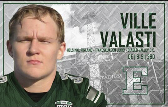 Itäkeskuksesta itä-MichiganiinEastern Michiganin yliopisto sijaitsee Ypsilantissa Suurten järvien välissä vajaat 50 kilometriä Detroitista länteen. Yliopiston joukkue Eagles pelaa Mid-American Conferencessa (MAC). Syksyllä 2016 joukkue voitti 12 ottelustaan seitsemän ja pelasi lopulta Bahamas Bowlissa, jossa kuitenkin taipui Old Dominionille 20–24. Valastille on luvassa syksyn 2017 aikana muun muassa mielenkiintoiset Michiganin sisäiset välien selvittelyt, sillä MAC:n länsidivisioonassa pelaavat EMU:n lisäksi myös Central Michiganin ja Western Michiganin joukkueet. Lisäksi Valastin joukkue kohtaa muun muassa Rutgersin ja Armyn joukkueet. Suomalaista eksotiikkaa ilmestyi välittömästi allekirjoituksen jälkeen myös Eastern Michiganin yliopiston. Name: Ville Valasti. High school: Itakeskuksen lukio, Helsinki.