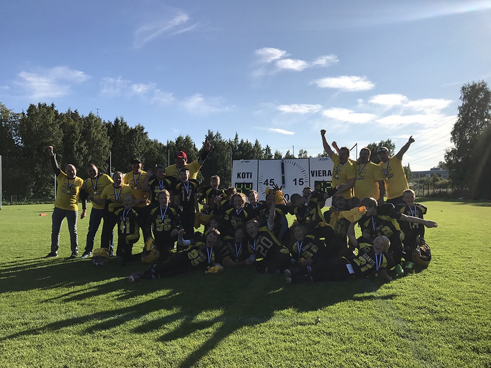 Giants ja Wolverines kamppailivat mestaruudesta huippuolosuhteissa. Sunnuntaina tehtiin Myllypurossa, itä-Helsingissä jenkkifutishistoriaa. Tuolloin nimittäin pelattiin kautta aikain ensimmäinen 13-vuotiaiden SM-loppuottelu. Finaalissa toisistaan ottivat mittaa omia alkusarjalohkojaan hallinneet kotijoukkue East City Giants sekä Espoo Wolverines. Kotijoukkue karkasi avauspuoliajalla jo 30 pisteen johtoon ja kontrolloi toisella puolikkaalla pelikelloa voittaen lopulta 44–12. ECG:n voiton avaimia olivat linjapeli kummallakin puolella palloa. Linjan lisäksi koko muu joukkue osallistui tienraivaamiseen, kun ottelun pisterohmu, keskushyökkääjä Akseli Asikainen viimeisteli viisi touchdownia. Asikaisen lisäksi pisteidenteossa onnistui Juulio Vahlan heitosta maalin tehnyt Valtteri Virokannas, joka myös toimitti laadukkaasti lisäpistepotkuja haarukkaan. Puolustuksessa linjakolmikko Jaakko Jalkanen – Juuso Linja – Alex Huhtaniemi puolestaan rikkoi ansiokkaasti Wolverinesin peliä aiheuttaen useammankin pallonmenetyksen. Läpi kauden puolustuksia nopeudellaan pilkkonut Wolverines-hyökkääjä Lassi Pajarinen oli asetettu ECG:n toimesta erikoisvartiointiin eikä Giantsin puolustuksen etuyksikkö antanut Wolverinesin juoksupelille tilaa. – Olimme käyneet edellisissä Wolverines-otteluissa tarkkailemassa, miten he pelaavat, kertoo ECG:n valmennusryhmään kuuluva Toni Vahla. – Toisella puoliajalla Wolverines siirtyikin käyttämään enemmän neljän laitahyökkääjän muodostelmia ja heittämään. Saimme onneksi vastattua hyvin siihenkin. Joukkueensa parhaimmaksi valittu Pajarinen oli näkyvä pelaaja niin Wolverines-hyökkäyksessä kuin -puolustuksessakin ja lisäksi ulottuvat laitahyökkääjät Anssi Ruohonen ja Jesper Kotkansalo loivat jatkuvasti vaarallisia tilanteita. Kaksikko tekikin Wolverinesin touchdownit Pajarisen heitoista. Espoolaisten nuorimpiin pelaajiin lukeutuva Daniel Rubinstein taisteli itseään isompia pelaajia vastaan sisukkaasti tilanteessa kuin tilanteessa. ECG vei ottelun tauolle 30–0 –johdossa, mutta päävalmentaja Henri Kurki ja muu mustakeltaisten valmennusryhmä muistutti pelaajiaan kevään Super Bowlista, jossa Atlanta Falcons menetti nopeasti 28 pisteen johtoaseman. Vaikka kotijoukkue toisella puoliajalla pyörittikin paljon pelaajistoaan, onnistui Giants myös samaan aikaan kuluttamaan pelikelloa tehokkaasti. Viimeisen vihellyksen soidessa ECG:stä tuli kautta aikain ensimmäinen U13 –sarjan Suomen mestari lukemin 44–12. Myllypuroon oli rakennettu finaalinarvoiset puitteet. Katsomon kuppipenkeille oli saapunut reilut 150 katsojaa seuraamaan ottelua ja juhlantuntua tarjosivat myös kansallislaulu sekä nuorten peleissä harvemmin toteutetut ottelukuulutukset esittelyineen. Finaali oli finaalin arvoinen tapahtuma.