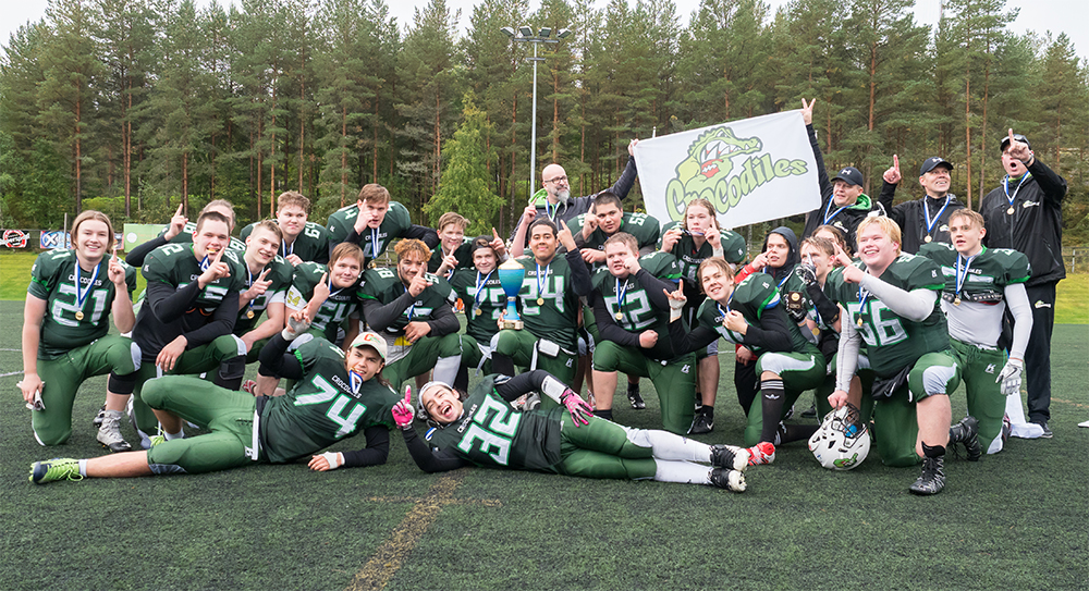 Seinäjoella pelattiin hyvissä puitteissa laadukas loppuottelu – Moni on yllättynyt näitä pelejä katsellessaan pelin tasosta ja laadusta. Joku luuli, että 17-vuotiaissa jurnutetaan divea keskeltä, mutta on tullut myöhemmin kertomaan olleensa väärässä. Nämä ovat kovatasoisia pelejä. Näin kuvailee tuore U17-sarjan Suomenmestarivalmentaja Juha Laitila ikäluokan otteluita ja pelin tasoa. Lauantaina Seinäjoella päävalmentaja Timo Tuokon ja Laitilan suojatit valloittivat Suomen mestaruuden kaatamalla finaalissa Porvoo Butchersin lukemin 24–14 (10–7). Finaali oli finaalin arvoinen tapahtuma. Pelaajaesittelyt tunnelista, Maamme-laulu ja ennen kaikkea kahden hyvän joukkueen pelaama ottelu pitivät vesisateesta huolimatta lähes 300-päisen yleisön otteessaan loppuvihellykseen asti. Ensimmäisenä Jouppilanvuoren tulostaulua koristeli kotijoukkue Crocodiles. Hyvän palautuksen jälkeen Crocodiles pääsi lähelle maalialuetta ja lopulta pelinrakentaja-potkaisija Jaakko Kasari toimitti pallon haarukkaan ja siirsi kotijoukkueen 3–0 -johtoon. Butchersin kuittaus oli tehokas ja kliininen. Pelinrakentaja Mikael Järvinen juoksi itse vahvasti ja yhteistyö erityisesti Kristian Natusen kanssa tuotti heittopelissä jaardeja läpi ottelun. Lopulta Miika Kuipers teki Järvisen heitosta touchdownin ja potkaisi perään tilanteeksi 3–7. – Sitten perinteiseen tapaan kello neljältä alkoi vesisade, Laitila muistelee ja naureskelee viimeviikkojen olosuhteille. – Heittopelimme ei toiminut, joten laitoimme voimakkaamman paketin sisään ja juoksimme. Pääsimme kolmen jaardin linjalle ja teimme option pelistä johto-osuman. Ensimmäisen puoliajan loppu ja toisen puoliajan alku olivat lopulta ottelun ratkaisuhetket. Laitilan mainitseman johto-osuman teki pelinrakentaja Kasari, joka juoksuhämäyksen jälkeen juoksi itse maalin ja potkaisi taukotilanteeksi 10–7. Toisen puoliajan alussa Butchers sai ensimmäisenä pallon, mutta heti ensimmäisessä hyökkäyspelissä Crocodiles riisti pallon itselleen ja kun ainoastaan 10 sekuntia kolmatta neljännestä oli kulunut, Eero Laitilan touchdown ja Kasarin potku oli nostaneet kotijoukkueen jo kymmenen pisteen johtoon. Crocodilesin voimakas juoksupeli pakotti Butchers-puolustuksen tulemaan lähemmäs aloituslinjaa. Kasarin juoksuhämäys tuotti jälleen tulosta ja tällöin ottelun arvokkain pelaaja, yhteensä 110 jaardia juoksuista ja kiinniotoista edennyt Joel Särkelä karkasi tekemään 55-jaardisella touchdownilla lukemiksi jo 24–7. Kapealla pelaajaringillä pelannut Butchers osoitti sisukkuutensa loppuun asti. Pelinrakentaja Järvinen juoksi vielä kavennusosuman ja yksi porvoolaisten hyökkäysvuoro pysähtyi vasta aivan maalilinjan tuntumassa. Kymmentä pistettä lähemmäs Butchers ei kuitenkaan missään vaiheessa päässyt, vaan Crocodiles valloitti mestaruuden lukemin 24–14. – Voiton ratkaisu oli koko joukkueen onnistuminen, Laitila uskoo. – Linjoissa olimme vahvempia ja puolustuksessa saimme porukalla taklattua Uchea (Butchersin keskushyökkääjä Uche Nwosu). Rangaistuksia meille liputettiin vain 30 jaardia. – Butchersilla on hyvä joukkue täynnä hyviä pelaajia. Muun muassa heidän takamiehet iskivät todella nopeasti kiinni laitahyökkääjiimme. Tämä oli ensimmäinen ottelu, kun joku teki Butchersia vastaan tällä kaudella kolme touchdownia. Tiesimme, että sen verran meidän pitääkin tehdä, mikäli heidät haluamme voittaa. Jaardimääräisesti Butchers eteni ottelussa enemmän 210–232, mutta kuten tuloskin kertoo, Crocodilesin viimeistely oli finaalissa tehokkaampaa.