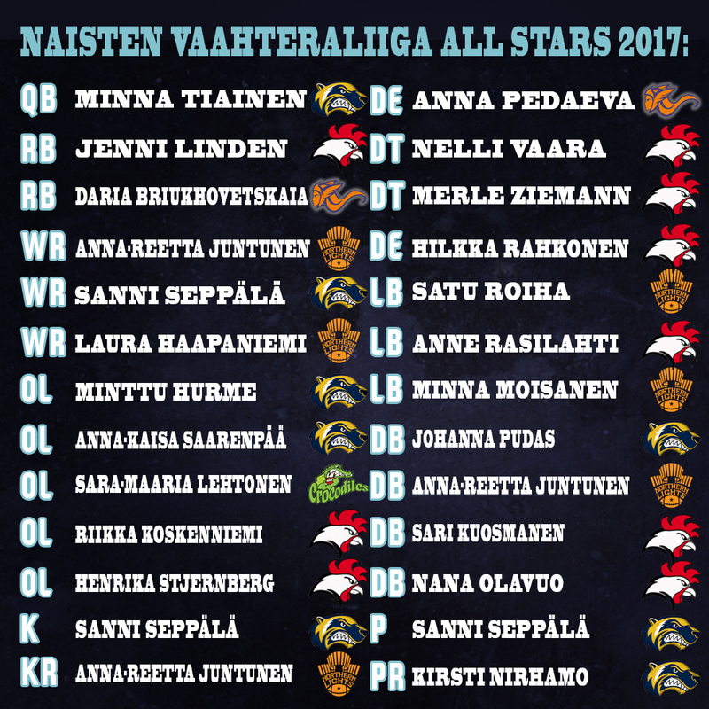 Palkitut 2017:VUODEN JENKKIFUTISAREENA: OmaSp Stadion, Seinäjoki VUODEN VAAHTERALIIGA EROTUOMARI: Veikko Lamminsalo VUODEN VALMENTAJA: Pekka Utriainen, Kuopio Steelers VUODEN 3-DIVISIOONA PELAAJA: Leevi Pikkarainen, Lohja Lions VUODEN 2-DIVISIOONA PELAAJA: Niclas Carpelan, Kotka Eagles VUODEN NAISTEN 2-DIVISIOONA PELAAJA: Laura Pulkkinen, Kuopio Steelers VUODEN 1-DIVISIOONA PELAAJA: Seth Peters, Kuopio Steelers VUODEN NAISTEN 1-DIVISIOONA PELAAJA: Iina Tähkänen, Tampere Saints VUODEN TULOKAS - NAISTEN VAAHTERALIIGA: Carola Lindholm, Helsinki Roosters VUODEN TULOKAS – VAAHTERALIIGA: Viljo Lempinen, Helsinki Roosters VUODEN LINJAPELAAJA - NAISTEN VAAHTERALIIGA: Nelli Vaara, Helsinki Roosters VUODEN LINJAMIES – VAAHTERALIIGA: Arttu Tennberg, Porvoo Butchers VUODEN ETENIJÄ - NAISTEN VAAHTERALIIGA: Anna-Reetta Juntunen, Oulu Northern Lights VUODEN ETENIJÄ, VAAHTERALIIGA - ARI TUULI TROPHY: Mikko Seppänen, Porvoo Butchers VUODEN PUOLUSTAJA - NAISTEN VAAHTERALIIGA: Satu Roiha, Oulu Northern Lights VUODEN PUOLUSTAJA, VAAHTERALIIGA – MATTI LINDHOLM TROPHY: Santtu Äyräväinen, Helsinki Roosters VUODEN HYÖKKÄÄJÄ - VAAHTERALIIGA: RJ Long, Wasa Royals VUODEN HYÖKKÄÄJÄ – NAISTEN VAAHTERALIIGA: Jenni Lindén, Helsinki Roosters VUODEN PELAAJA - NAISTEN VAAHTERALIIGA: Sanni Seppälä, Helsinki Wolverines VUODEN PELAAJA - VAAHTERALIIGA: Brandon Connette, Helsinki Roosters |