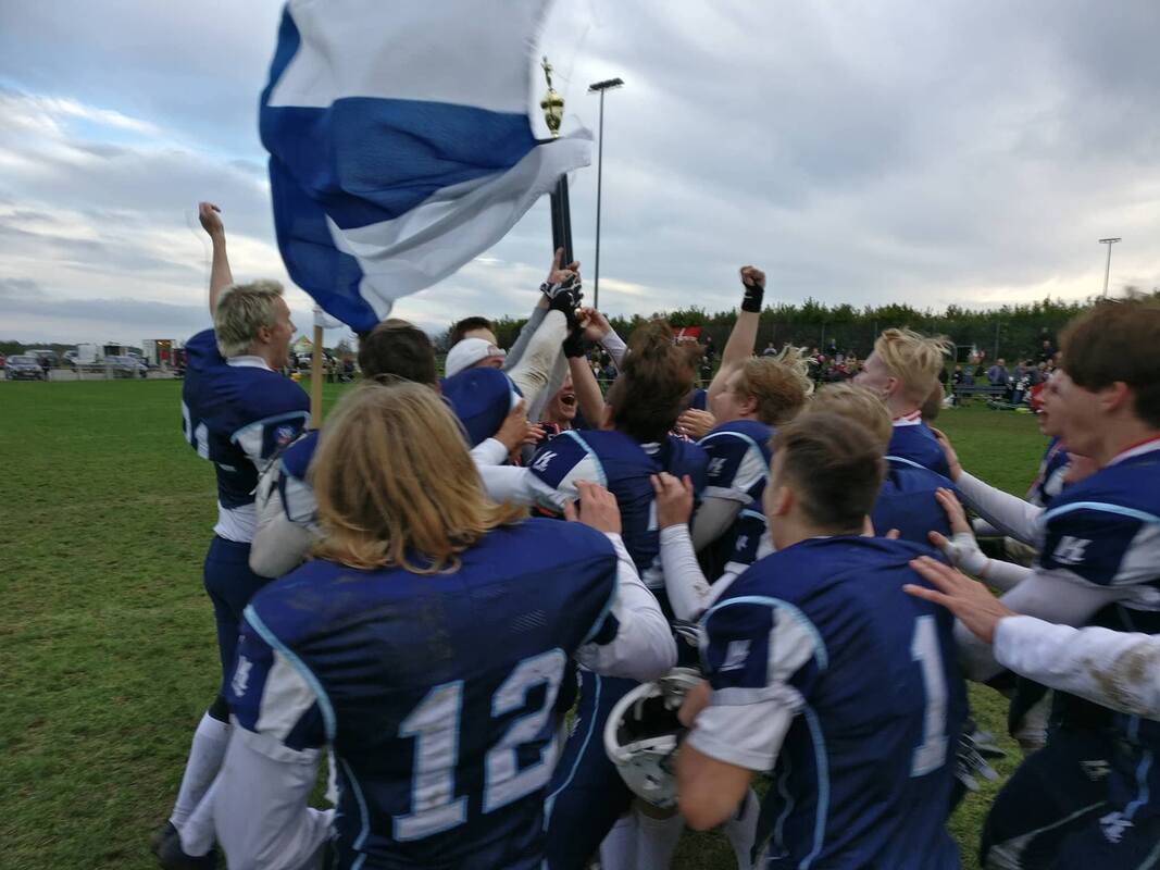 Pelinrakentaja Samuli Töyryn loistopeli ja teräksinen Leijona-puolustus takasivat PM-kultaa Suomelle Amerikkalaisen jalkapallon Pohjoismaiden mestaruuskisat päättyivät suomalaisjuhliin. Suomi kaatoi finaalissa isäntämaa Tanskan 12–31 (6–17). Aivan kuten välierässä Ruotsia vastaan, myös finaaliin Suomi sai hyvän lähdön. Tanska tiesi, että Suomelta löytyy voimaa juosta vahvoista muodostelmista, mutta tästä huolimatta lounaisnaapurimme eivät tähän keksineet keinoja juoksuvyörytyksen patoamiseen. Ensimmäisellä neljänneksellä Joel Särkelä juoksi touchdownillaan Suomen 0–6 –johtoon. Miika Kuipersin potku koristeli tilannetta vielä yhdellä pisteellä. Tanskan hyökkäys pysyi hyvin Suomen pihdeissä koko ottelun ajan. Kotijoukkue pääsi kuitenkin avausneljänneksellä peliin mukaan puolustajan riistettyä pallon ja palautettuaan sen suoraan maaliin asti. Lisäpiste ei kuitenkaan onnistunut ja näin ollen johto pysyi Suomella - lopulta loppuu n asti. Yksi Suomen PM-kisasankareista on ehdottomasti potkaisija-kulmapuolustaja Kuipers, jonka korkeat lentopotkut tuottivat palauttajille suuria vaikeuksia kummassakin ottelussa. Finaalin avauspisteissä Suomi sai hyvän kenttäaseman, kun Tanskan palauttaja pudotti lentopotkun ja suomalaiset sen peittivät. Toisella neljänneksellä Kuipers lisäsi puolestaan kenttäpotkumaalilla Suomen johdon lukemiin 6–10. Kaiken kaikkiaan Kuipersin tilille merkittiin ottelussa seitsemän tehtyä pistettä. Pelinrakentaja Samuli Töyry pelasi lauantaina huomattavasti tanskalaista virkaveljeään varmemmin ja Suomi pystyi näin ollen sekoittamaan punahousuisten puolustusta sekä tiiviillä voimapelillä että avoimella heittopelillä. Santtu Vehkomäki, Arttu Ketonen ja Kristian Ristilä ottivat Suomelle tärkeitä koppeja ja erityisesti Ketonen osoittautui tanskalaisille liian nopeaksi pallonkantajaksi. Hänen irtiottonsa kasvatti Suomen johdon toisella neljänneksellä jo kymmeneen pisteeseen ja kun Kuipers vielä touchdownin jälkeen latasi jälleen pallon haarukkaan, Suomi johti puoliajalla 6–17.