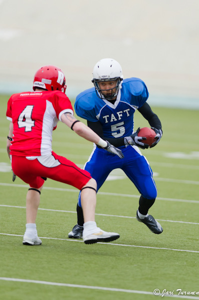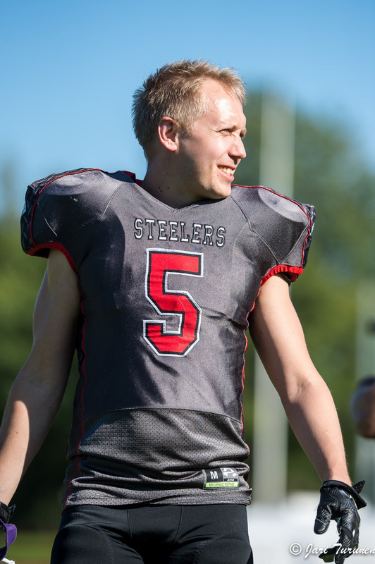 Miten aikanaan päädyit lajiin nimeltä amerikkalainen jalkapallo?Jenkkifutiksen pariin päädyin googletettuani Vantaalla asuessani syksyllä 2007 "amerikkalainen jalkapallon Vantaa". Tätä edelsi 80-luvun lopulla alkanut jalka- eli potkupalloura, joka loppui melko yllättäen keväällä 2006, kun huomasin oikeastaan aidosti ensimmäistä kertaa elämässäni, että treeneihin lähtö tuntui vastenmieliseltä. Vuoden ajan yritin uskotella itselleni ja silloiselle tyttöystävälleni pystyväni elämään normaalia aikuisen ihmisen elämää, mutta aika pian oli löydettävä uusi riippuvuus. Jenkkifutis kolahti heti ja ensimmäisten liikuntasalissa käytyjen jefu-treenien jälkeen alkoi oikeastaan saman tien tähän nykypisteeseen johtanut matka. Amerikkalainen jalkapallo minuun iski jo alle kouluikäisenä, silloiset Super Bowlit VHS-kaseteilta tuli katsottua puhki, kirjaimellisesti. Jefu oli aina mulle vähän sellainen haave, joka sitten 25-vuotiaana pääsi toteutumaan. Lukioaikaan muistan kun eri lajitaustoilla olevalla kaveriporukalla käytiin pelaamassa - varmaankin minun organisoimana - jotain lippupallon tyyppistä peliä, joka tosin muutaman minuutin jälkeen muuttui aina täyskontaktiversioksi. Ilman kamoja, tottakai. Monet muistavat sinut TAFT:n laitahyökkääjänä, mutta nyt vaikutat aidolta savolaiselta. Oletko kotoisin Kuopion seudulta vai Vantaalta? Ja miten yhteys näihin seuroihin on rakentunut?Pidän itseäni paljasjalkaisena savolais-karjalalaisena Kallion kundina. Eli Suomeksi olen syntynyt ja viettänyt lapsuuteni Kuopiossa, aikuinen minusta tuli pääkaupunkiseudulla. Entinen tyttöystäväni - nykyinen vaimoni - on myös vähän samoilla taustoilla, ja ollaan nyt palattu kotikaupunkiimme useamman vuoden sudeettiuden jälkeen. Meidän kaksi vanhinta lasta on syntynyt Kätilöopistolla, viimeinen täällä Savon sydämessä. Vanhin ei osaa sanaakaan Savon kieltä vieläkään. Niin ja se karjalalaisuus tulee veren perintönä, mutta saattaa olla minussa se vahvin luonteessa näkyvä osa. TAFT tulee aina varmasti olemaan minulle tärkeä sana, mutta olen aika huono saamaan itseäni sitoutumaan mihinkään epämääräiseen nimeen - ihmisethän tässäkin hommassa on kaikki tai ei mitään. Viisi TAFT-vuotta sisälsi ison tukun ihmisiä, jotka ovat minulle paljon enemmän kuin seuran edustajia, ja niin on nyt Steelersissäkin. Kuopion Palloseuraa olen elämästäni pisimpään edustanut, Kopareissa ja Kuopion Elossa pelannut junnuissa ja kaiken kaikkiaan potkupalloa kuudella korkeimmalla sarjatasolla eri joukkueissa edustanut, eli en ole varsinaisesti mikään seurauskollisuuden ilmentymä. Mikä on itsellesi jenkkifutiksessa "the juttu":a. pelaajana,b. valmentajana jac. katsojana?Katsojana jenkkifutiksessa minua kiehtoi ja kiehtoo toki edelleen pelin taktisuus ja strategia. Pelaajana uskoin, että samat asiat olisivat ne kiinnostavimmat, mutta pelin fyysinen puoli, oman pelon voittaminen ja kaikki siihen psykologiaan liittyvä asia alkoi kiehtoa heti kun sain ensimmäistä kertaa jefu-kamat päälle. Pelko ei tässä lajissa liity todellakaan pelkästään kontaktiin, vaan myös vahvasti häviämisen pelkoon ihan eri tavalla kuin vaikkapa jalkapallossa. Ratkaiseva downi ja tiedät, että pelinrakentaja tulee etsimään sinua heitollaan - sitä tunnetta lähelle pääsee jalkapallossa vain rangaistuspotkukilpailussa. Valmentajana edellä mainitut asiat ovat toki myös kiinnostavia, mutta suurimmat fiilarit tässä koutsina saa siitä, kun pelaajat kehittyvät. Ja ne kehittyvät suhteessa valtalajeihin vielä aikuisenakin todella huimasti jos ja kun - kuten meillä - pelaajat alkavat harjoittelemaan kuten asiaan kuuluu. Parasta, mitä tästä voi saada, on se mitä valmentajana näkee ja mitä pelaajat itse eivät: urheilullinen ja taidollinen kehitys, pelaajien sisäinen vaatimustason nousu. ”Kulttuuri” oli meillä pitkään kirosana, mutta nyt voi jo monelta osin puhua harjoituskulttuurista positiiviseen sävyyn. Varsinaisesti pelaamiseen liittyvistä asioista valmentajana parasta minulle on pelien kutsuminen. Strategina tai taktikkona en ole varmasti monen muun rinnalla vielä, mutta pelin ”flown” tai jonkinlaisen mystisen rytmin tunnistamisessa koen olevani hyvä. Joku sanoisi savolaisia ajatuksia, mutta sivurajalla pelissä mukana oleminen on - paremman sanan puutteessa - kiihottavaa.