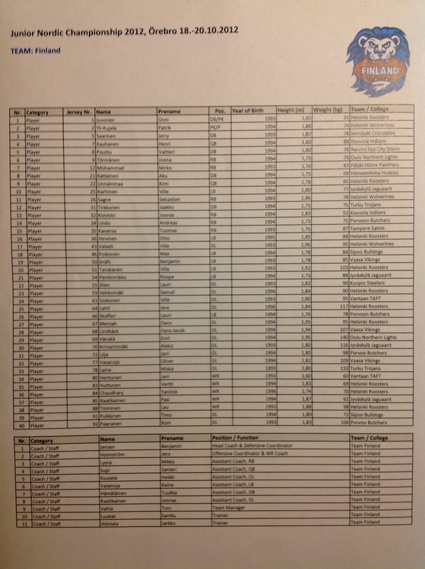 Ottelu alkaa kello 13.30. Eilen niukasti Tanskalle hävinnyt Suomen U19-maajoukkue kohtaa tänään Ruotsin. Kello 13.30 alkavan ottelun näet suorana lähetyksenä osoitteessa http://www.orebroguiden.com/guidentv/ Ruotsi voitti avausottelussa Tanskan 40-20. Liitteessä Suomen rosteri jossa myös pelinumerot mukana. Suomelle niukka tappio PM-kisoissa (19.10.2012) Liitteet