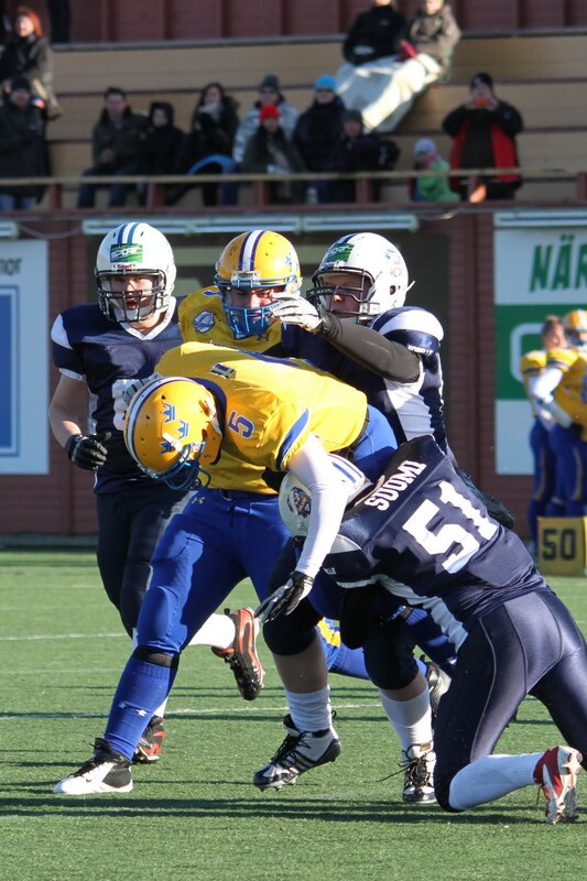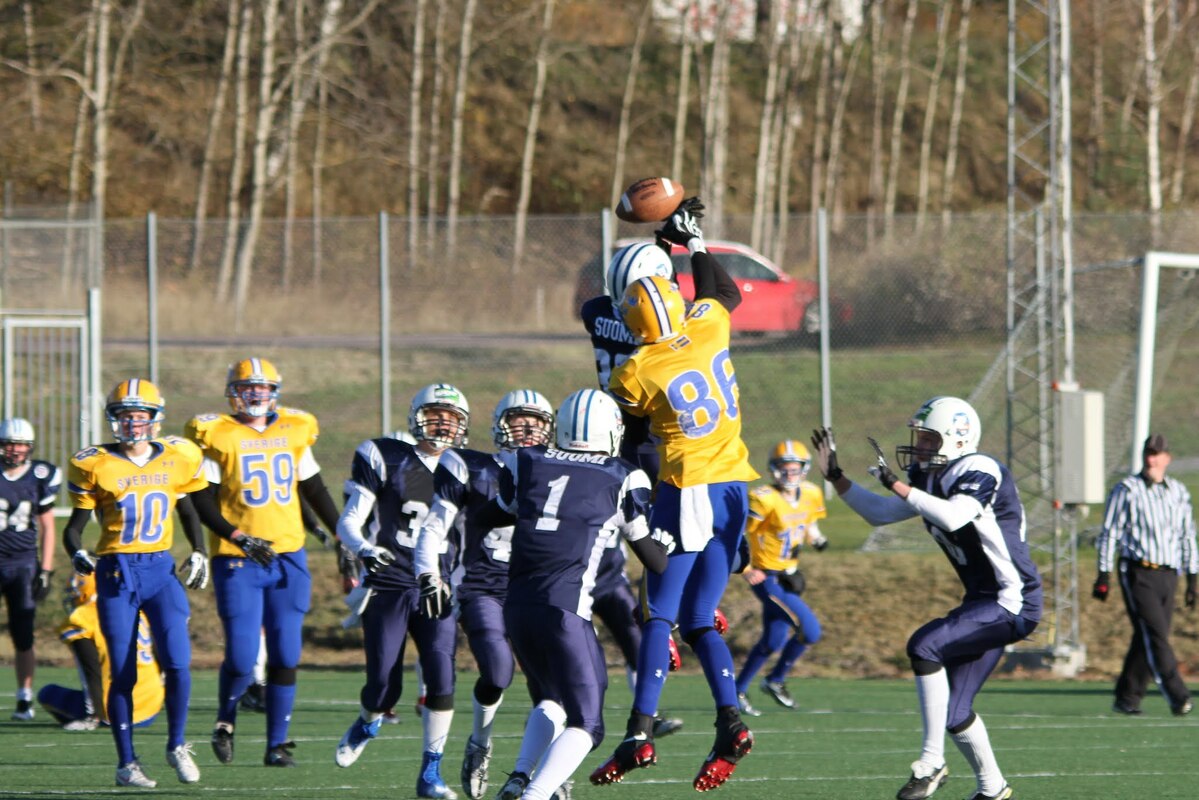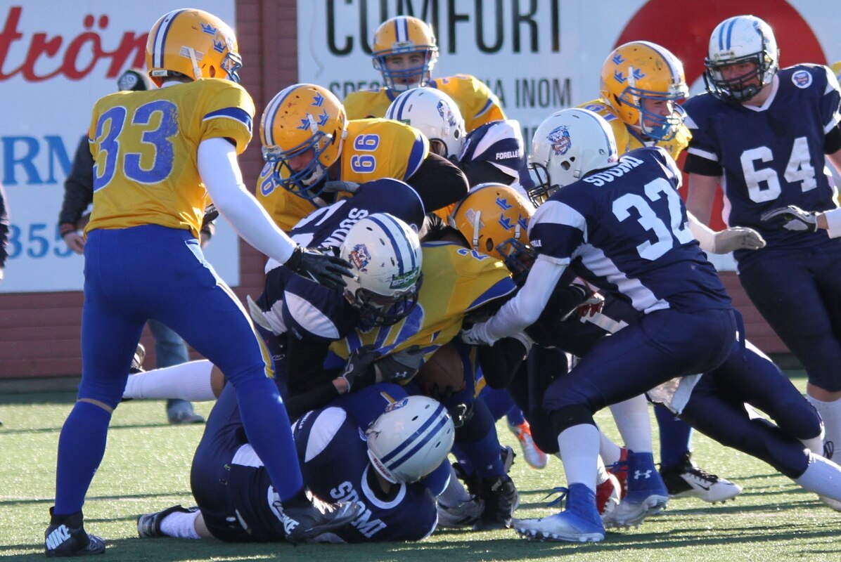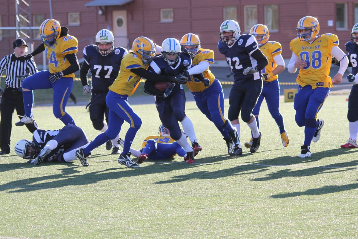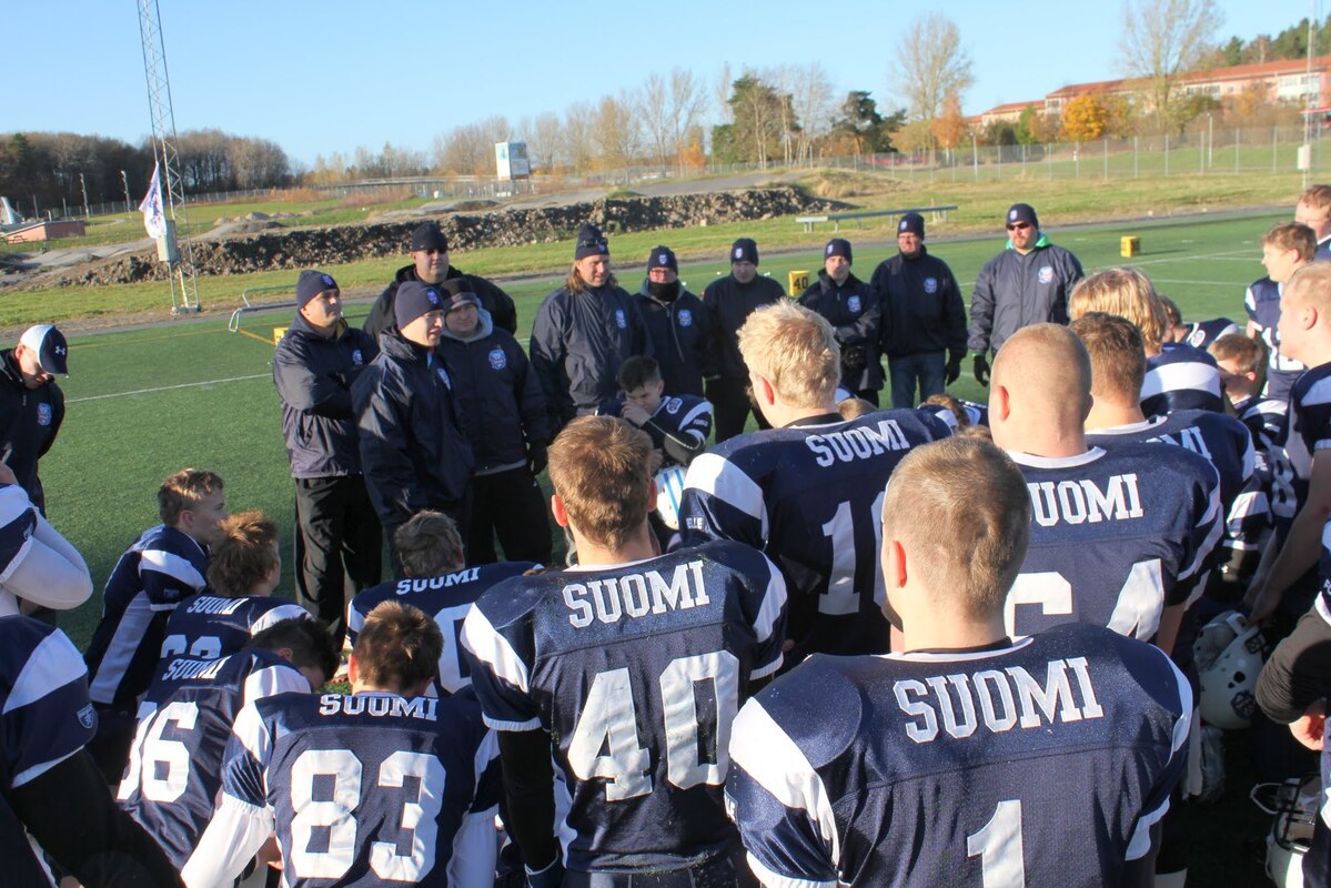 Suomen U17 maajoukkue voitti Ruotsin 7-13 (0-6) Märstassa pelatussa ottelussa. Suomen maalisuorituksista vastasivat tamperelaiset Tuukka Lehtonen ja Kimmo Jokinen, jotka juoksivat molemmat maalit. Aurinkoisen viileässä säässä pelatussa maaottelussa Suomi oli kuskin paikalla lähes koko ottelun. Ensimmäisellä puoliskolla pallo pomppi suomalaishyökkääjien käsissä ja pallonmenetyksiä tapahtui luvattoman paljon. Ote siirtyi kuitenkin Suomelle ja pelinrakentaja Otto Konola onnistui heittämään kaksi peräkkäistä pitkää heittoa, ensin 25 jaardia Kalle Kilickesenille ja 22-jaardia Paavo Väänäselle. Keskushyökkääjä Tuukka Lehtonen väänsi hyvästä kenttäasemasta kolmen jaardin juoksumaalin, joka jäi samalla ensimmäisen puoliajan ainoiksi pisteiksi 0-6. Lisäpistepeli meni pieleen miehistövaihdon vuoksi. Suomen tasapainoinen hyökkäys juoksi ja heitti läpi ottelun. Hyökkäyslinja toimi hyvin ja sai hyvän pelirytmin Ruotsin aggressiivista blitziin perustunutta puolustusta vastaan. Hyökkäyslinjassa miehiä kierrätettiin aktiivisesti. Suomi hallitsi kenttäasemia läpi ottelun. Suomen toisen maalin juoksi 4:llä neljänneksellä Kimmo Jokinen. Päivän hienoimmassa suorituksessa Jokinen pyrähti 54 jaardia trap-pelin päätteeksi. Suomi johti ottelua 0-13, kun Jaakko Koivunen potkaisi lisäpisteen sisään onnistuneesti. Suomalaishyökkääjistä pelinrakentaja Otto Konola heitti 3 onnistunutta heittoa 11 yrityksellä. Näillä tuli etenemistä 60 jaardia ja yksi syötönkatko lisättiin hänen sarakkeeseensa. Juoksupeli kulki hyvin ja ottelun work horse Tuukka ”Veikan pikkuveli” Lehtonen kantoi 15 yrityksellä 82 jaardia. Fullback Kimmo Jokinen eteni 65 jaardia viidellä pallonkantokerralla. Keskushyökkääjä Mai Tri Thach lisäsi suomalaisten juoksusaldoon 29 jaardia viidellä yrityksellä. Suomen puolustus pelasi varmasti ja piti Ruotsin poissa maalintekoalueelta. Puolustuksen pelaaminen oli kollektiivinen rytistys, sillä peräti 17 pelaaja keräsi tilastomerkinnän puolustussarakkeeseen. Kaikki yhdeksän linjapuolustajaa piti vauhtia yllä läpi ottelun ja mm. Jaakko Aroheinä onnistui säkittämään kahdesti ruotsalaispelinrakentajan. Tukimies Jaska Väriselle merkittiin yksi 10 jaardia miinukselle päätynyt säkitys. Puolustustuksen hienon päivän kruunasi Peik Lehtisen, Samuli Vehkomäen, Juhani Jurvakaisen ja Ville Rajalaisen taklaukset linjan takana. Akseli Arvaja taklasi ruotsalaisia kolmen soolon verran ja Jaska Värinen levittäytyi jokapuolelle suorittaen 5,5 taklausta. Suomalaispuolustuksesta Saintsin Benjamin Ylipää otti yhden syötönkatkon. Päävalmentaja Tero Virtanen: - Suomi teki niitä asioita, joita osasi. Ruotsilla oli jälleen isokokoinen ja fyysinen joukkue, mutta tällä kertaa Suomi voitti keskittymällä perusfutiksen pelaamiseen. Suomi on edellisen kerran voittanut Ruotsin vuonna 2008, kun ikäryhmän maaottelusarja aloitettiin. Ottelun palkinnot: Game MVP Aleksi Arvaja |