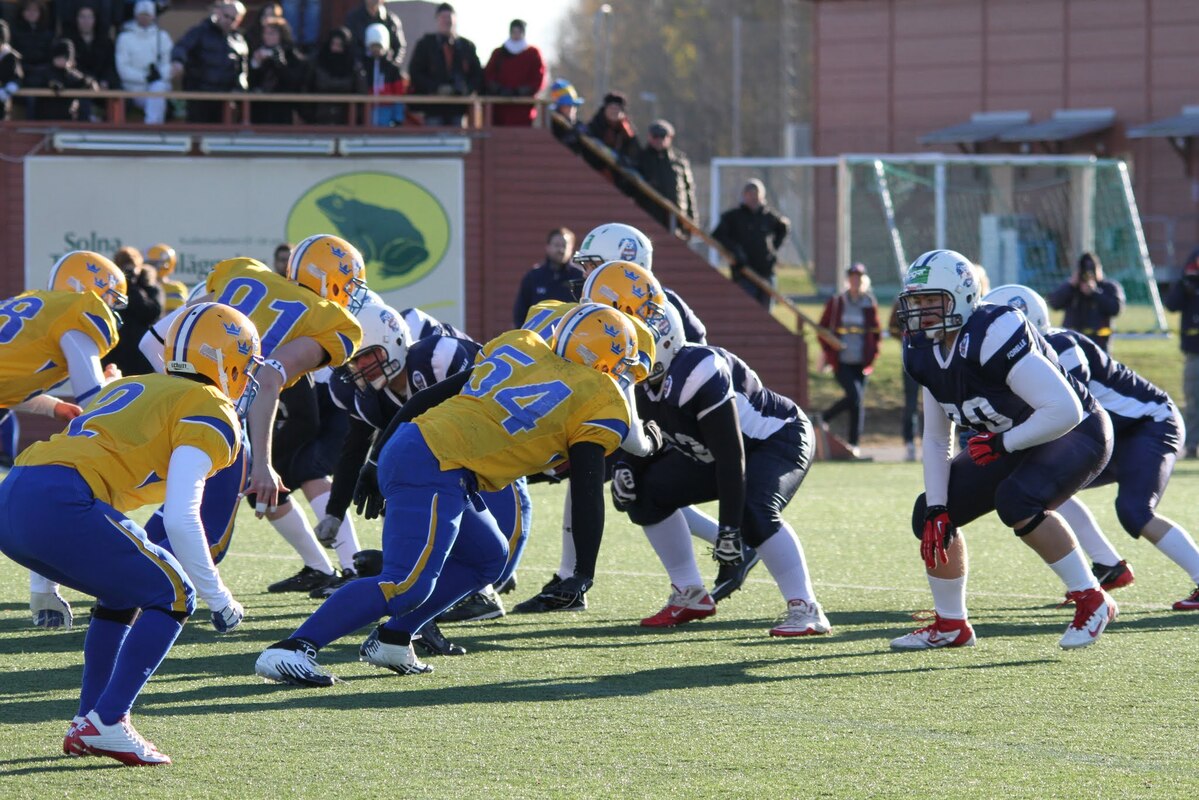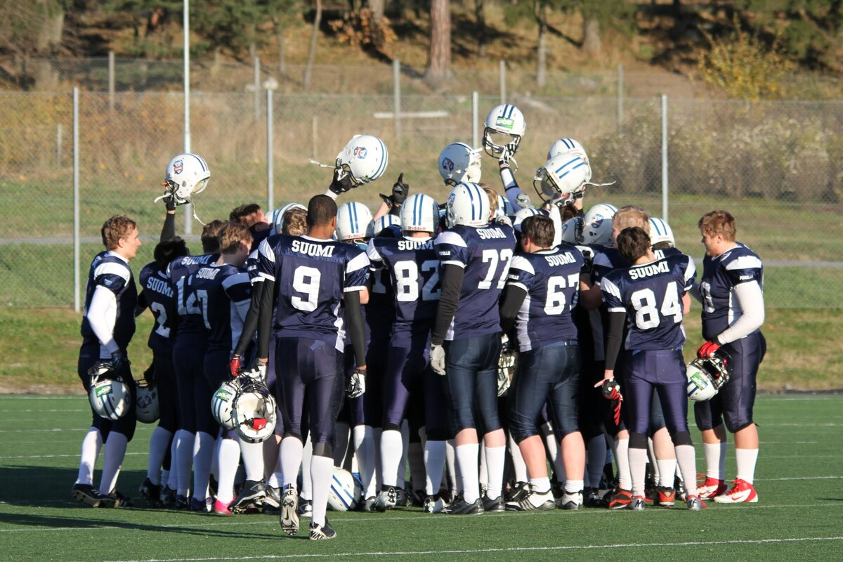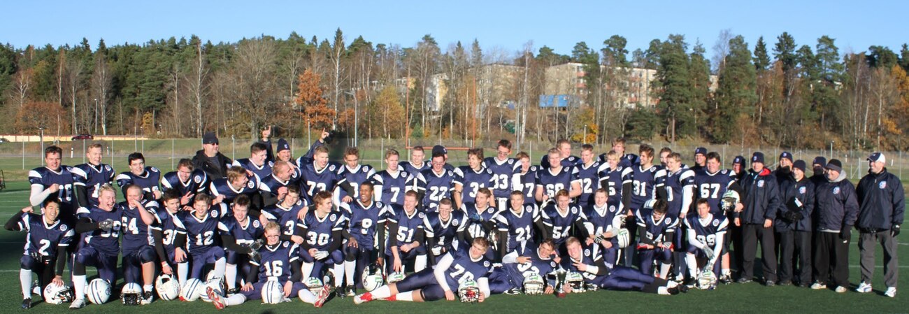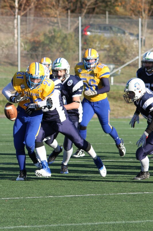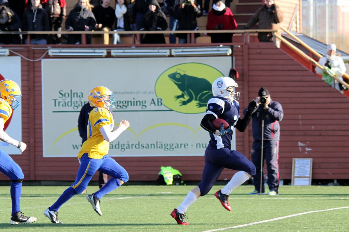 Suomen U17 maajoukkue voitti Ruotsin 7-13 (0-6) Märstassa pelatussa ottelussa. Suomen maalisuorituksista vastasivat tamperelaiset Tuukka Lehtonen ja Kimmo Jokinen, jotka juoksivat molemmat maalit. Aurinkoisen viileässä säässä pelatussa maaottelussa Suomi oli kuskin paikalla lähes koko ottelun. Ensimmäisellä puoliskolla pallo pomppi suomalaishyökkääjien käsissä ja pallonmenetyksiä tapahtui luvattoman paljon. Ote siirtyi kuitenkin Suomelle ja pelinrakentaja Otto Konola onnistui heittämään kaksi peräkkäistä pitkää heittoa, ensin 25 jaardia Kalle Kilickesenille ja 22-jaardia Paavo Väänäselle. Keskushyökkääjä Tuukka Lehtonen väänsi hyvästä kenttäasemasta kolmen jaardin juoksumaalin, joka jäi samalla ensimmäisen puoliajan ainoiksi pisteiksi 0-6. Lisäpistepeli meni pieleen miehistövaihdon vuoksi. Suomen tasapainoinen hyökkäys juoksi ja heitti läpi ottelun. Hyökkäyslinja toimi hyvin ja sai hyvän pelirytmin Ruotsin aggressiivista blitziin perustunutta puolustusta vastaan. Hyökkäyslinjassa miehiä kierrätettiin aktiivisesti. Suomi hallitsi kenttäasemia läpi ottelun. Suomen toisen maalin juoksi 4:llä neljänneksellä Kimmo Jokinen. Päivän hienoimmassa suorituksessa Jokinen pyrähti 54 jaardia trap-pelin päätteeksi. Suomi johti ottelua 0-13, kun Jaakko Koivunen potkaisi lisäpisteen sisään onnistuneesti. Suomalaishyökkääjistä pelinrakentaja Otto Konola heitti 3 onnistunutta heittoa 11 yrityksellä. Näillä tuli etenemistä 60 jaardia ja yksi syötönkatko lisättiin hänen sarakkeeseensa. Juoksupeli kulki hyvin ja ottelun work horse Tuukka ”Veikan pikkuveli” Lehtonen kantoi 15 yrityksellä 82 jaardia. Fullback Kimmo Jokinen eteni 65 jaardia viidellä pallonkantokerralla. Keskushyökkääjä Mai Tri Thach lisäsi suomalaisten juoksusaldoon 29 jaardia viidellä yrityksellä. Suomen puolustus pelasi varmasti ja piti Ruotsin poissa maalintekoalueelta. Puolustuksen pelaaminen oli kollektiivinen rytistys, sillä peräti 17 pelaaja keräsi tilastomerkinnän puolustussarakkeeseen. Kaikki yhdeksän linjapuolustajaa piti vauhtia yllä läpi ottelun ja mm. Jaakko Aroheinä onnistui säkittämään kahdesti ruotsalaispelinrakentajan. Tukimies Jaska Väriselle merkittiin yksi 10 jaardia miinukselle päätynyt säkitys. Puolustustuksen hienon päivän kruunasi Peik Lehtisen, Samuli Vehkomäen, Juhani Jurvakaisen ja Ville Rajalaisen taklaukset linjan takana. Akseli Arvaja taklasi ruotsalaisia kolmen soolon verran ja Jaska Värinen levittäytyi jokapuolelle suorittaen 5,5 taklausta. Suomalaispuolustuksesta Saintsin Benjamin Ylipää otti yhden syötönkatkon. Päävalmentaja Tero Virtanen: - Suomi teki niitä asioita, joita osasi. Ruotsilla oli jälleen isokokoinen ja fyysinen joukkue, mutta tällä kertaa Suomi voitti keskittymällä perusfutiksen pelaamiseen. Suomi on edellisen kerran voittanut Ruotsin vuonna 2008, kun ikäryhmän maaottelusarja aloitettiin. Ottelun palkinnot: Game MVP Aleksi Arvaja |