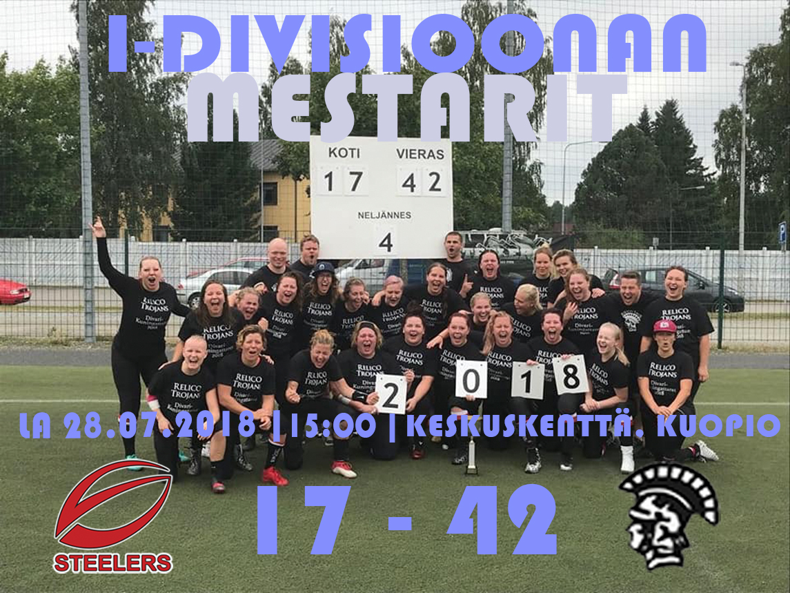 Kuopion Keskuskentällä pelatussa loppuottelussa kaatui Kuopio Steelers Naiset lukemin 17–42 (3–24). Turku Relico Trojans Women juhli lauantaina Naisten I-divisioonan mestaruutta. Kuopioon matkanneet turkulaisnaiset päihittivät finaalissa Steelers Naiset lukemin 17–42 (3–24). Täksi kaudeksi jenkkifutiskartalle palanneet turkulaiset jatkoivat omaa tappiotonta recordiaan ja katkaisivat vastaavasti hyvän vastuksen tarjonneen Steelersin voittokulun. – Mulla oli aika hyvä fiilis meidän joukkueesta heti alkuun. Saatiin oma heittopeli rullaamaan ja löydettiin sitä kautta tilaa kentältä, kommentoi Trojans pelinrakentaja Jonna Hakkarainen peliä. Trojans otti komennon kentällä heti alkuvihellyksestä. Turkulaisten hyökkäys eteni Hakkaraisen johdolla päämäärätietoisesti eteenpäin eikä Steelers tahtonut löytää lääkkeitä heidän pysäyttämiseen. Steelersin avauspuolikkaan ainoa pistesuoritus tuli kenttäpotkumaalista. – Peli oli koko ajan meidän käsissä. Heitto oli auki ja (Kirsti) Nirhamo sekä (Jutta) Luhtala ottivat hyviä koppeja. Steelersin puolustuksen fyysisyys kuitenkin hieman yllätti meidät – Essi Saastamoisen niitit tuntuvat vieläkin kropassa, kertoi Hakkarainen. Ottelun kuva toisella puoliajalla oli ensimmäisen kaltainen. Steelers yritti kaikkensa, mutta Trojans puolustus ei antanut jaardiakaan ilmaiseksi ja onnistui vastaavasti omilla hallintajaksoillaan kasvattamaan omaa pistetiliään. Kuopiolaiset pääsivät kyllä etenemään varsin mallikkaasti, mutta yritykset joko loppuivat auttamatta kesken tai turkulaispuolustus pakotti heidät punttaamaan. Steelersin juoksuhyökkäykselle Hakkarainen jakaakin kehuja. – Steelersin keskushyökkääjä Laura Pulkkinen painoi hyvin jaardeja eteenpäin. Ottelussa viisi maalia alustanut ja itse yhden touchdownin viimeistellyt Hakkarainen johti joukkueensa hyökkäystä varmoin ottein. Heitto kulki ja tarvittaessa Lea Kaszas keräsi jaloilla tarvittavat jaardit. Steelersin maalit syntyivät ottelun loppuhetkillä, mutta voittoon asti se ei riittänyt. Kuopiolaiset tarjosivat upean vastuksen ja peli oli kaikin puolin viihdyttävää jenkkifutista. Tappiostaan huolimatta, Steelers nähdään ensi kaudella Naisten Vaahteraliigassa, johon se on Trojansin ohella jo lunastanut paikkansa. Aurajoen ylpeyden kausi ei suinkaan lopu tähän vaan jatkuu vajaan kahden viikon kuluttua välieräottelulla Helsinki Wolverinesia vastaan. Tällä kaudella I-divisioonan voittajalla on mahdollisuus viedä nimiinsä myös Naisten Vaahteraliiga. Hakkarainen odottaakin helsinkiläisten kohtaamista innolla. – Aiomme treenata ihan sikana! Katsotaan, jos tuomme peliin jotain uutta. Toisaalta, meidän peruspeli on kyllä uomissaan – tulee hyvä matsi.