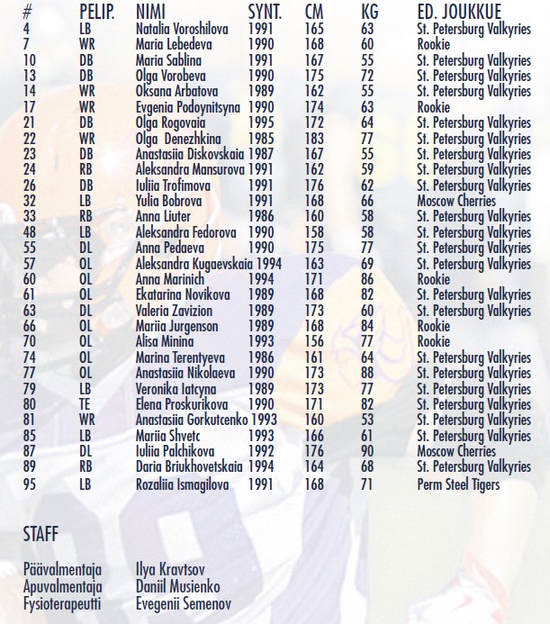 Finalistijoukkueiden Helsinki Wolverinesin ja Pietari Valkyriesin kokoonpanot.
