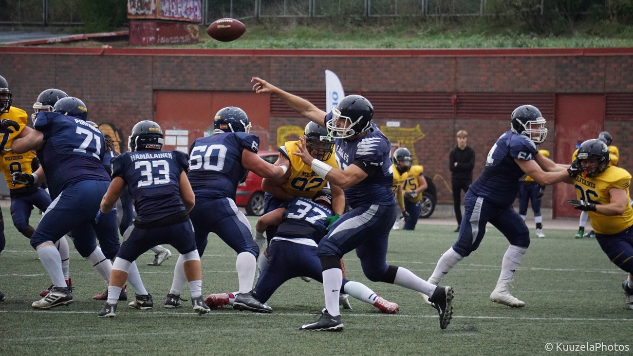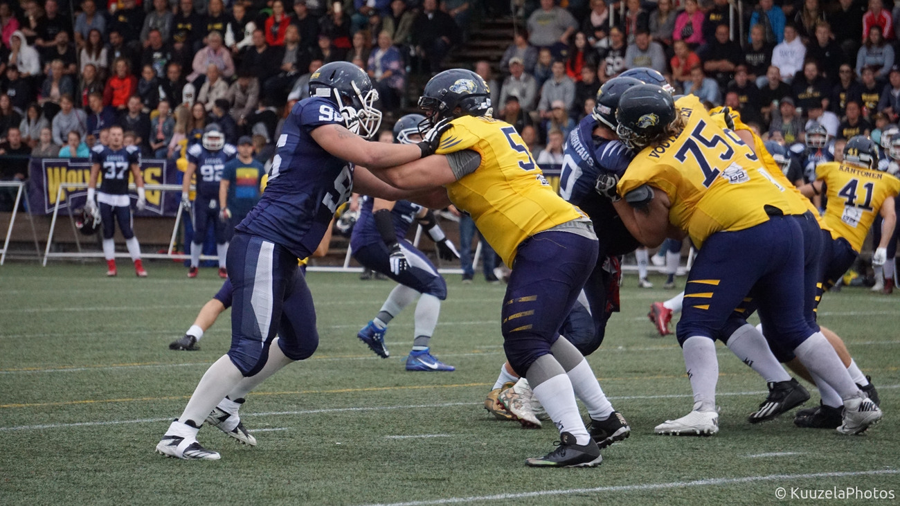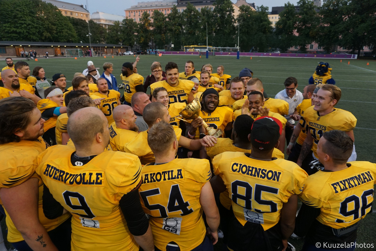 Spagettimaljassa kaatui Kotka Eagles 42-8 (28-0) Wolverines päätti voitollaan kahden spagettimaljan tappioputken ja voitollaan nousee Vaahteraliigaan kaudelle 2019. Eagles aloitti ottelun vahvasti. Se eteni ensimmäisellä hyökkäysvuorolla läpi kentän ja kulutti kelloakin yli puolet ensimmäisestä neljänneksestä, mutta vauhti pysähtyi Wolverinesin 16-jaardin linjalle jaardin vajaaksi uusista yrityksistä. Kotkan edetessä pääasiassa lyhyillä peleillä, Wolverines puolestaan eteni pitkillä peleillä. Arttu Erkkilän ja Kam Harriksen kiinniotoilla päästiin heti ensimmäisellä hyökkäysvuorolla maalialueen tuntumaan, josta Harris juoksi avauspisteet kotijoukkueelle kun ensimmäistä neljännestä oli jäljellä hieman yli kaksi minuuttia. Eaglesin seuraava hyökkäysvuoro käynnistyi hyvin. Muutamalla heitolla joukkue eteni lähes puoleen kenttään, mutta tie pysähtyi pallonkantajan rähmäykseen heti puolen kentän jälkeen. Eagles puolustus onnistui hidastamaan Wolverinesin hyökkäystä, mutta pysäytykseen asti se ei päässyt. Harris juoksikin Wolverinesin 14-0 johtoon Tomi Jokisen lisäpisteellä, kun toista neljännestä oli jäljellä 8 minuuttia. Kun Eagles päätyi lentopotkuun seuraavassa hyökkäysvuorossa käyttäen kello hieman yli minuutin, oli Wolverinesilla käsissään mahdollisuus lähteä karkumatkalle. Wolverines käyttikin tilaisuuden hyväkseen ja siirtyi 21-0 johtoon Arttu Erkkilän napattua Robert Johnsonin lyhyen heiton hyppysiinsä maalialueella. Seuraavassa hyökkäysvuorossa alkoi olla jo ratkaisun makua. Eagles käynnisti hyökkäysvuoronsa omalta kenttäpuoliskoltaan, mutta pitkä heitto yritys päättyi Richard Chungongin 53-jaardin syötönkatkonpalautusmaaliin. Jokisen potkaistessa lisäpisteen sisään, siirtyi Wolverines puoliajalle 28-0 johdossa. Toisen puoliajan ensimmäisellä hyökkäysvuorolla Wolverines eteni tasaisesti lyhyillä juoksuilla ja heitoilla, kunnes Johnson tavoitti Marcus Siiskosen 21-jaardin heitolla maalialueelta. Wolverinesin 35-0 johtoon siirsi kaikki lisäpisteet onnistuneesti potkinut Jokinen. Eagles vastasi pitkällä hyökkäysvuorolla, jonka päätteeksi Niklas Carpelan syöksyi maalialueelle 1-jaardin juoksulla. Eaglesin lisäpistepelissä Carpelanin heitto tavoitti Jani Heinisalon kaventaen tilanteeksi 35-8. Tänään ei kuitenkaan tämän tiukempaa tilannetta. Wolverines teki vielä yhden maalin kolmannen neljänneksen loppuun Niko Kantosen kiinniotolla Johnsonin heitosta puolesta kentästä. Tämän jälkeen lisäpistesuorituksia ei enää nähtykään, vaikka molemmat joukkueet kertaalleen etenivätkin lähelle vastustajan maalialuetta. Joukkueiden parhaina palkittiin Eaglesin Kaleb Wezdenko ja Wolverinesin Arttu Erkkilä. Wolverines pelinrakentaja Robert Johnson nappasi puolestaan ottelun arvokkaimman pelaajan palkinnon. Wolverines päävalmentaja Kari Titola oli onnellinen voitosta ja koko joukkueen erinomaisesta pelistä – ”Hienoa nähdä, että koko joukkue pelasi parhaan pelinsä silloin, kun se eniten merkitsi. Erityismaininta puolustukselle, joka vuosi sitten finaalissa päästi 70 pistettä ja tänään teki yhtä monta pistettä kuin päästi.”