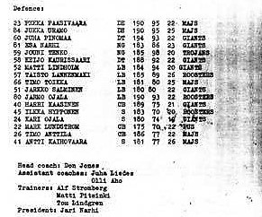 Ennen Suomen ja Italian välistä loppuottelua luonnehti Don Jones maajoukkuetta suureksi kurinalaiseksi ja yhtenäiseksi perheeksi. Jonesin mukaan kahden viikon yhtenäinen asuminen ja runsaat harjoitukset olivat hyvin muovanneet kuudesta eri seurasta kootut pelaajat yhtenäiseksi joukkueeksi.